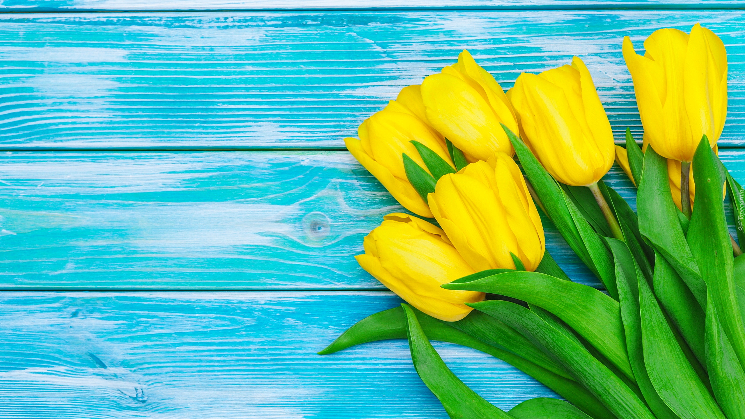 Edytor tapety: Żółte tulipany ułożone na niebieskich deskach