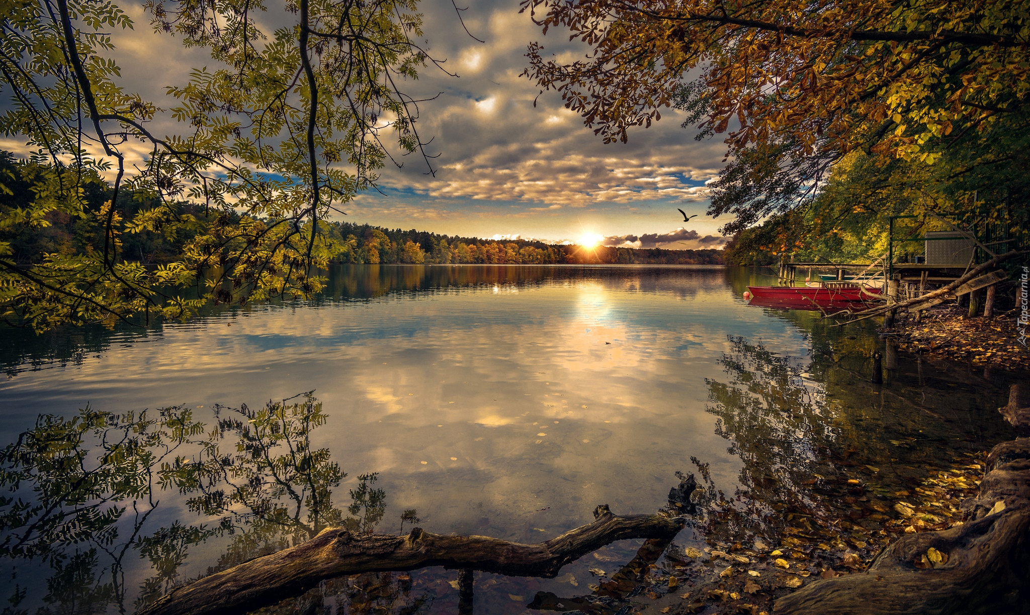Edytor tapety: Jesienne drzewa nad jeziorem o zachodzie słońca