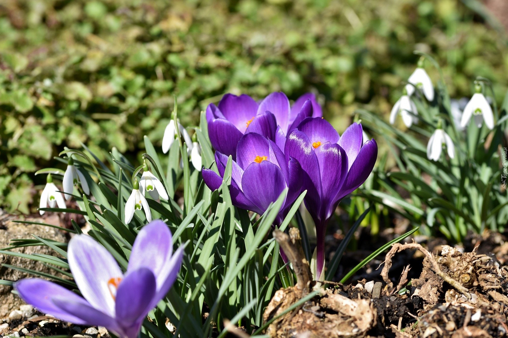 Edytor tapety: Fioletowe krokusy obok przebiśniegów