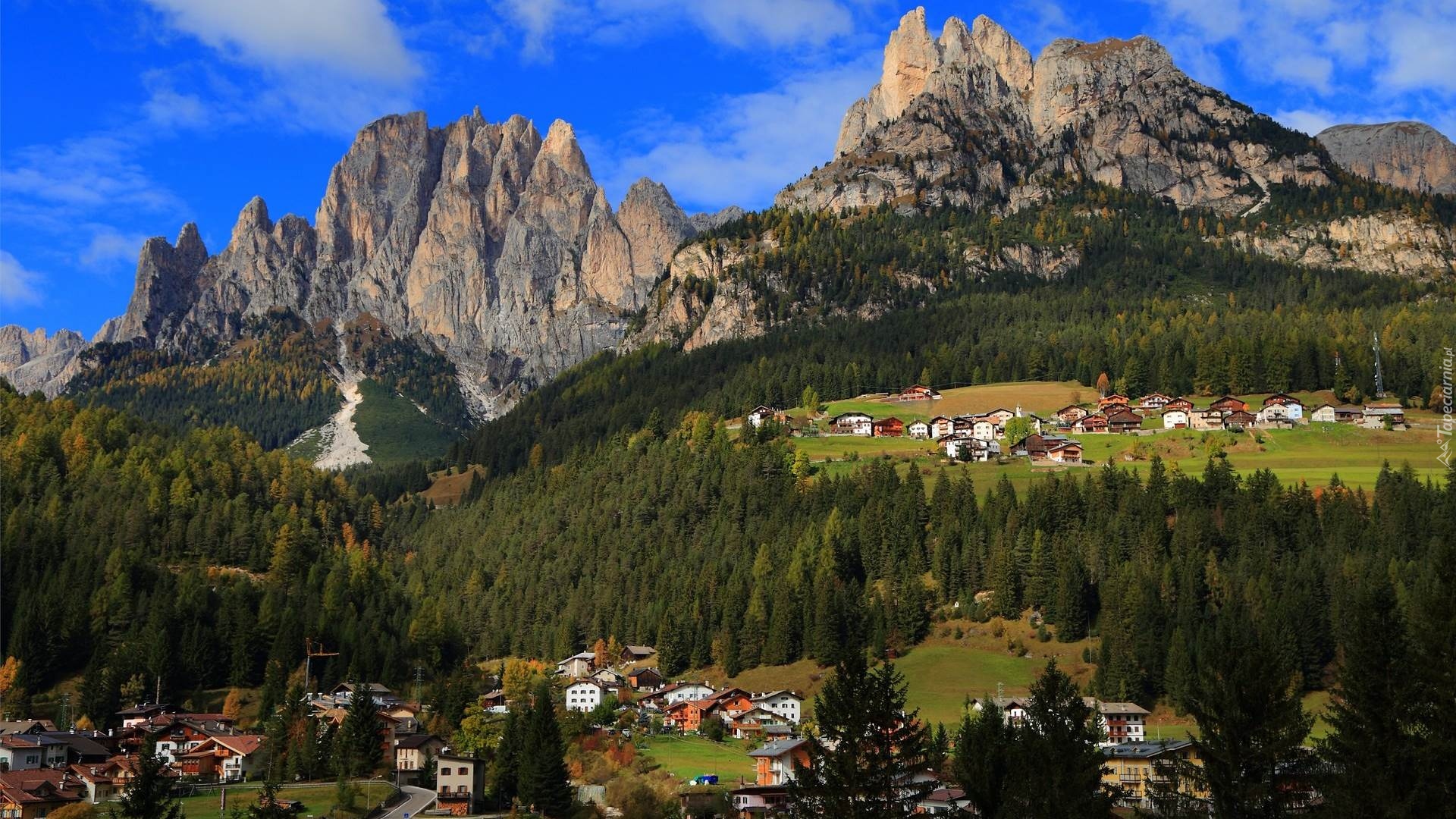 Edytor tapety: Miasteczko w dolinie na tle górskich szczytów