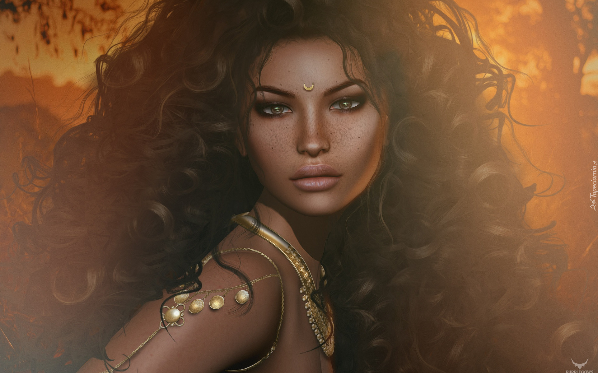 Edytor tapety: Piegowata kobieta z długimi kręconymi włosami