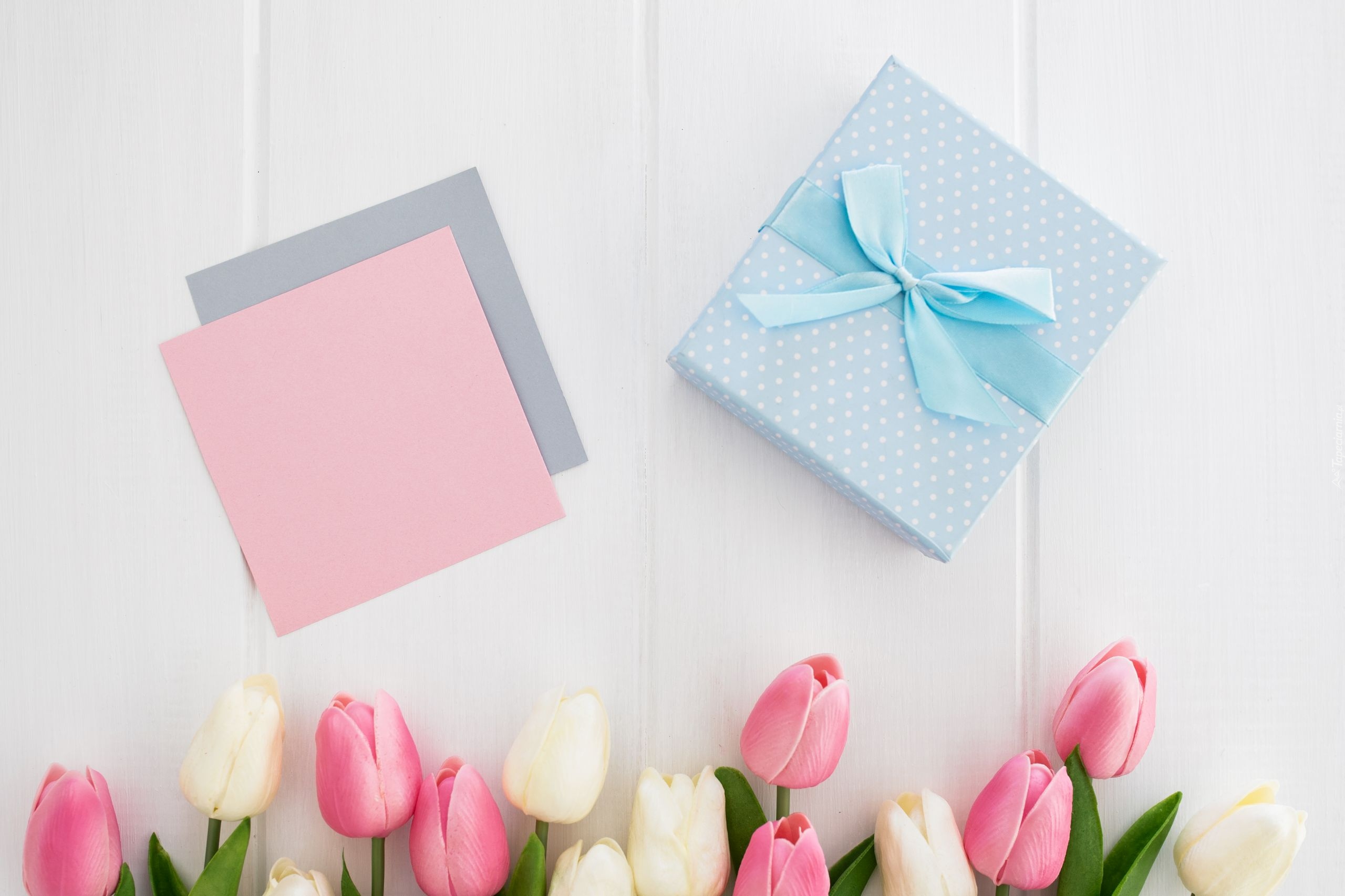 Edytor tapety: Prezent i kolorowe kartki nad tulipanami