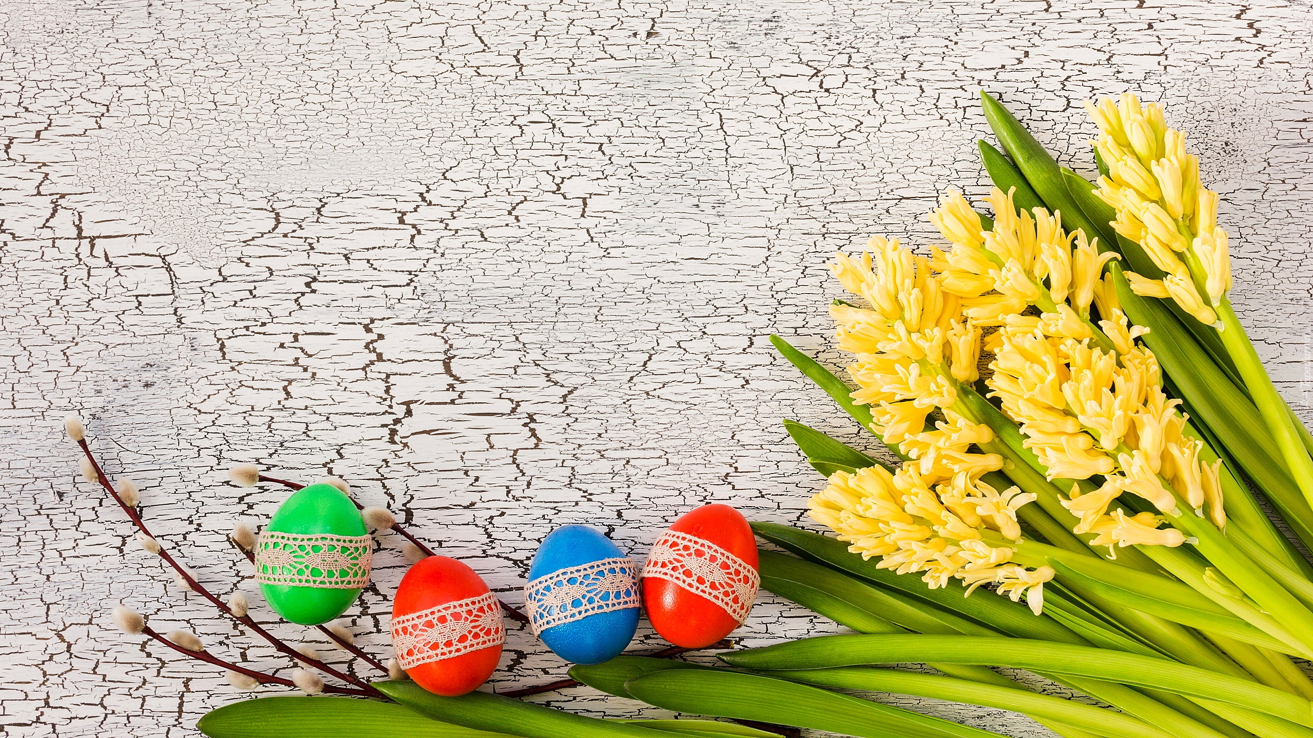 Edytor tapety: Pisanki na baziach przy żółtych hiacyntach