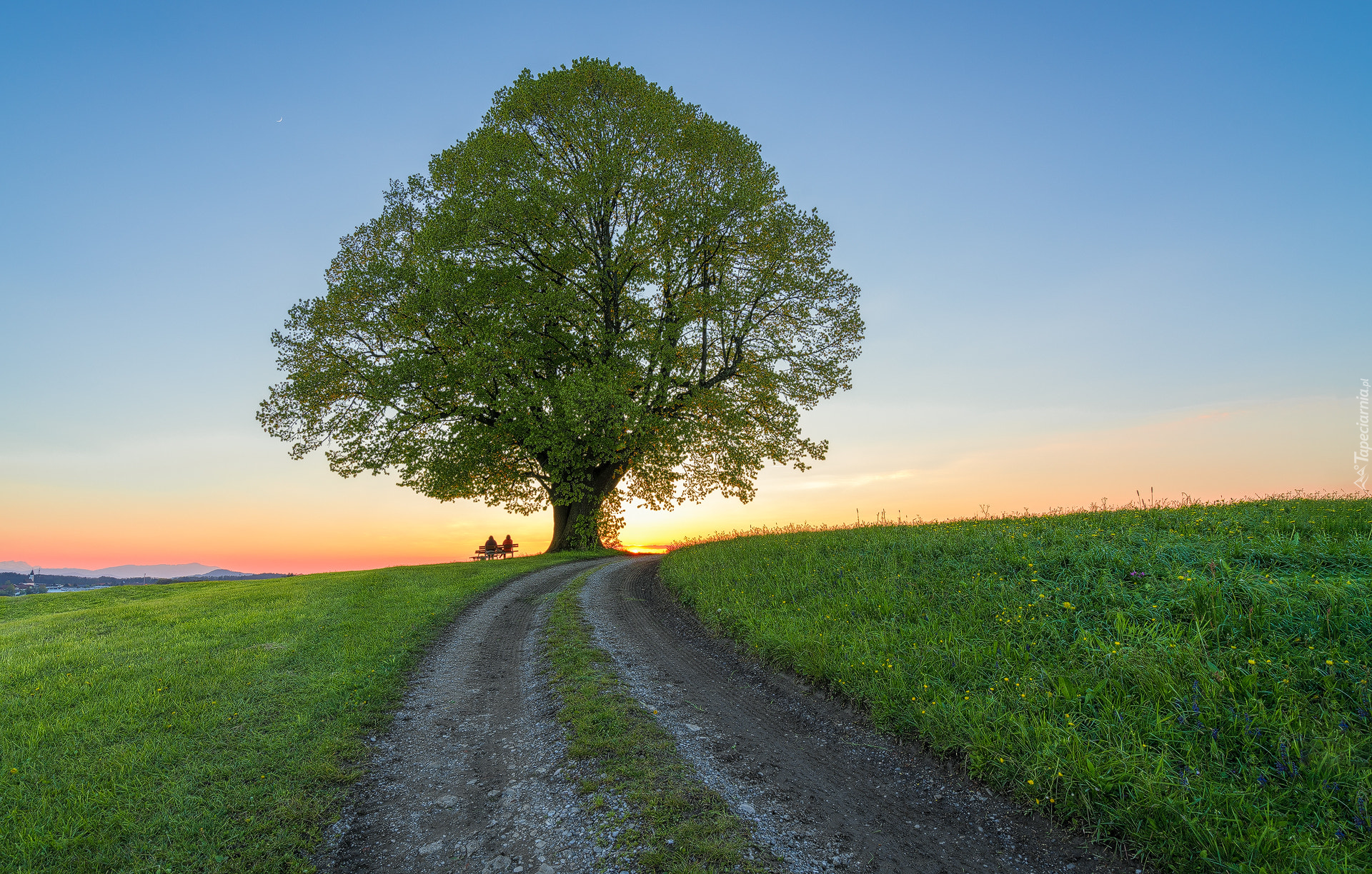 Edytor tapety: Ławka pod drzewem przy polnej drodze