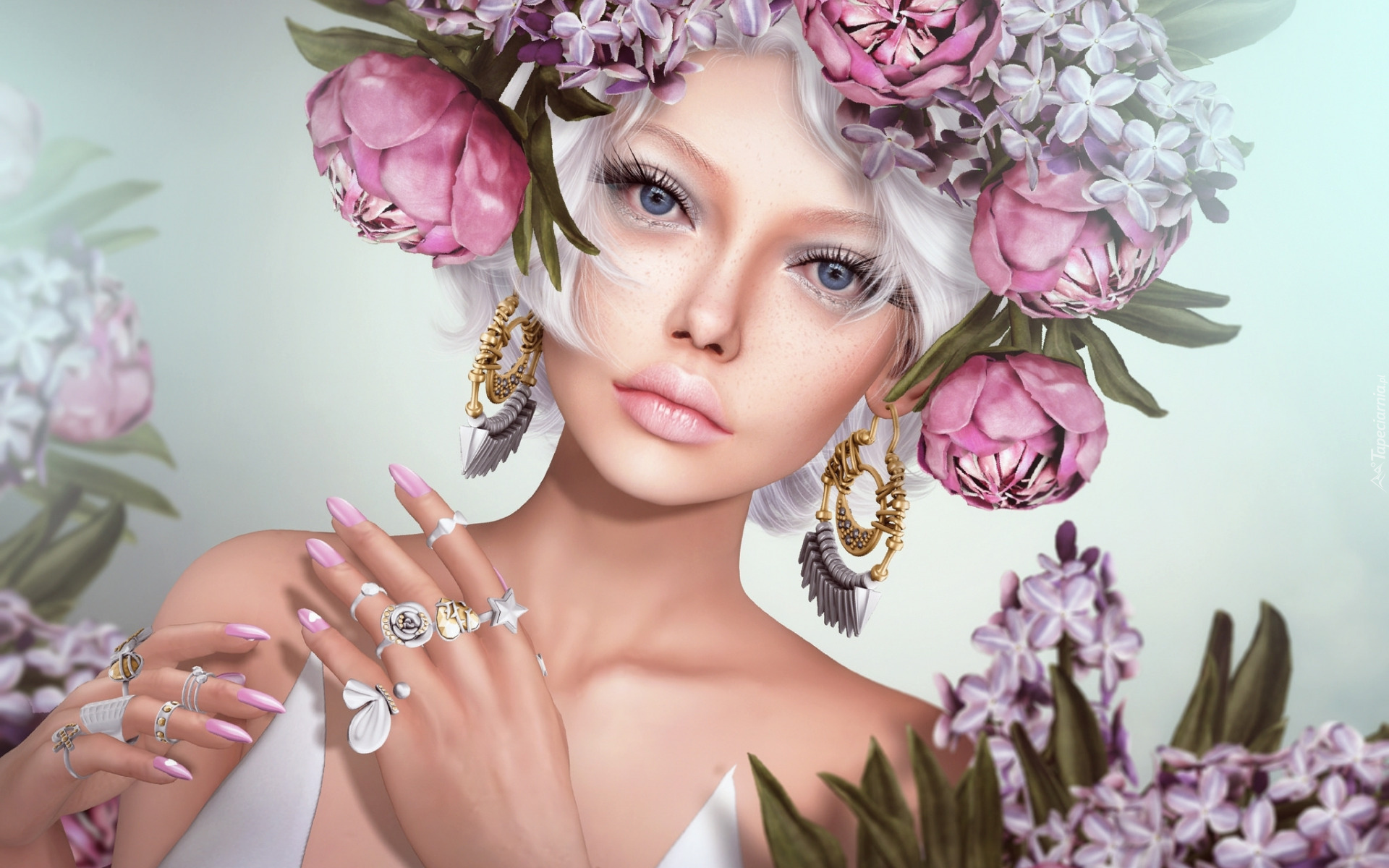 Edytor tapety: Dziewczyna z kwiatami we włosach i biżuterii