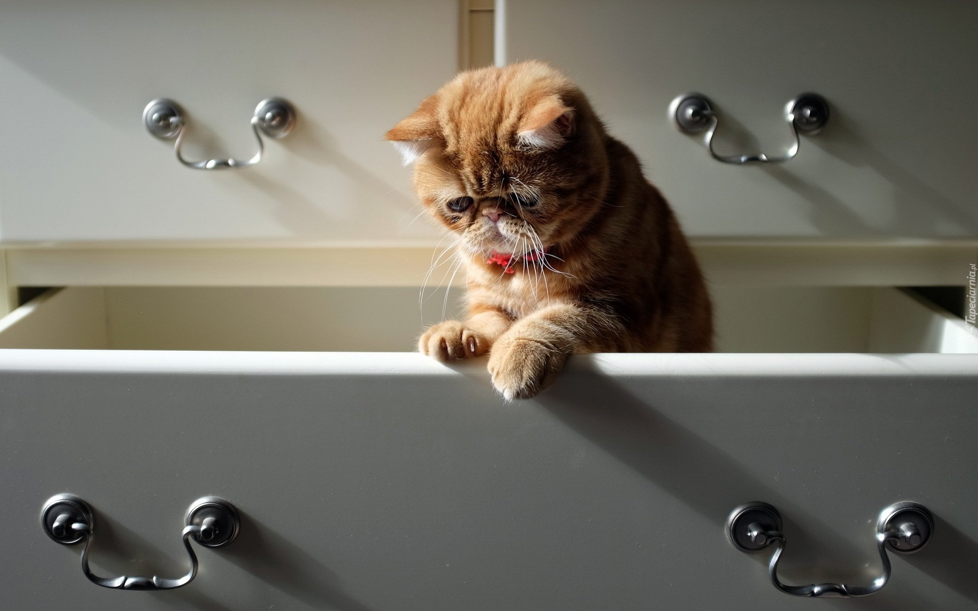 Edytor tapety: Mały rudy kotek w szufladzie komody