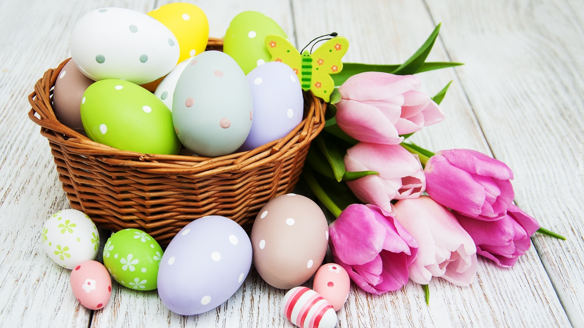 Edytor tapety: Pisanki w koszyku obok tulipanów