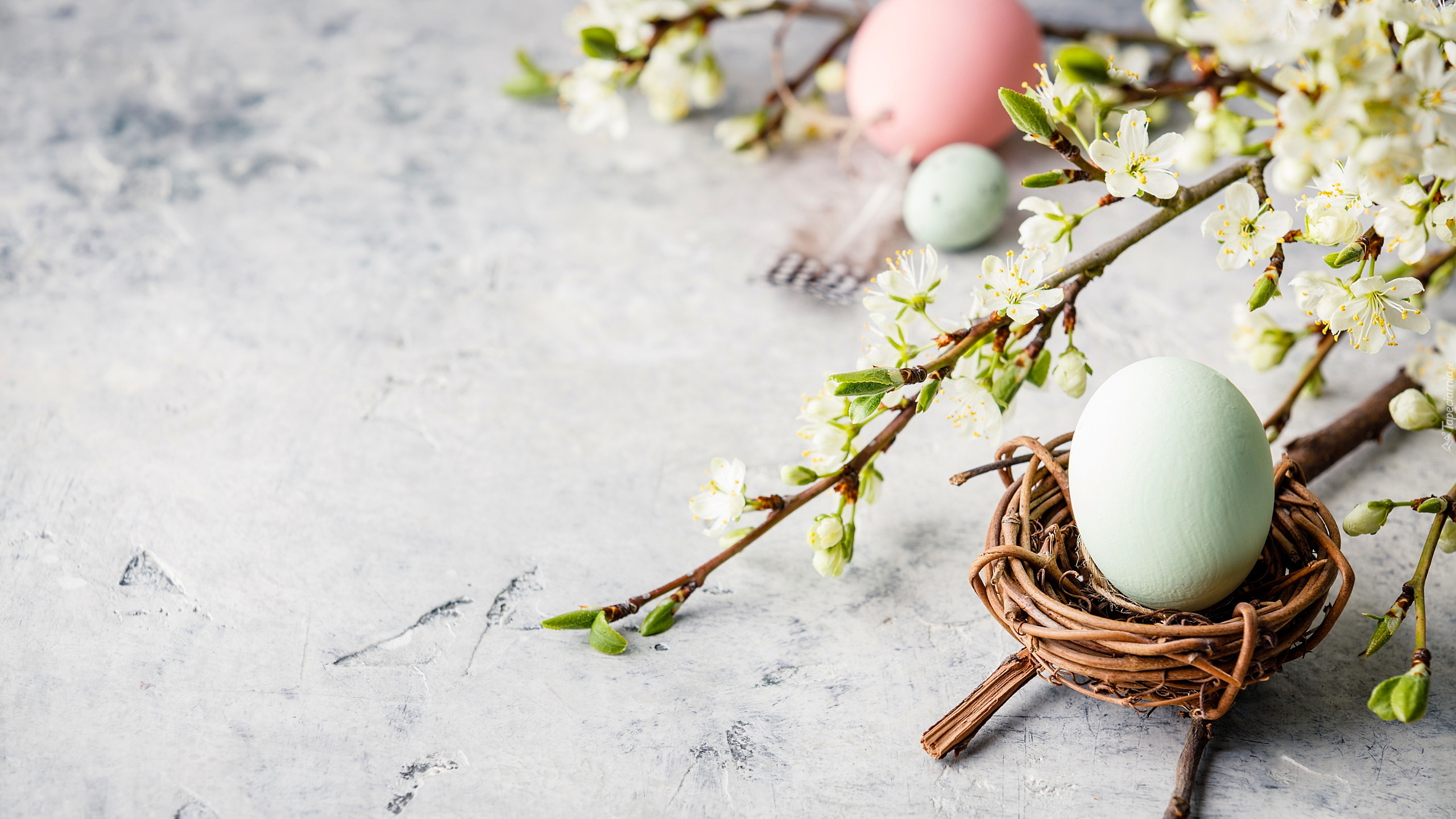 Edytor tapety: Jajko w gnieździe przy gałązkach kwiatowych