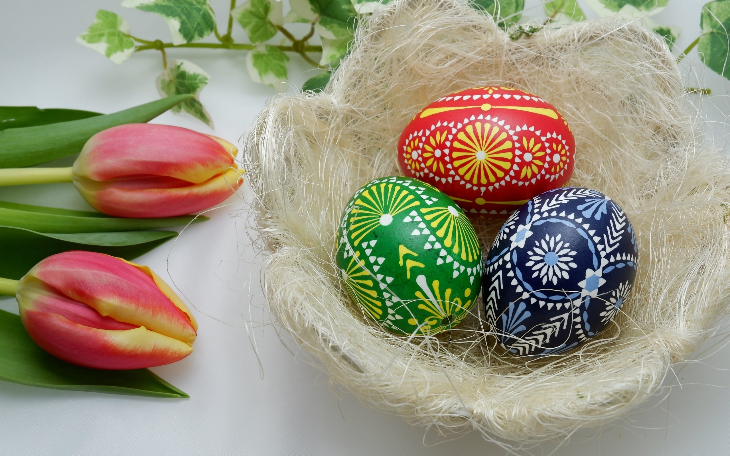 Edytor tapety: Trzy pisanki w koszyku obok tulipanów
