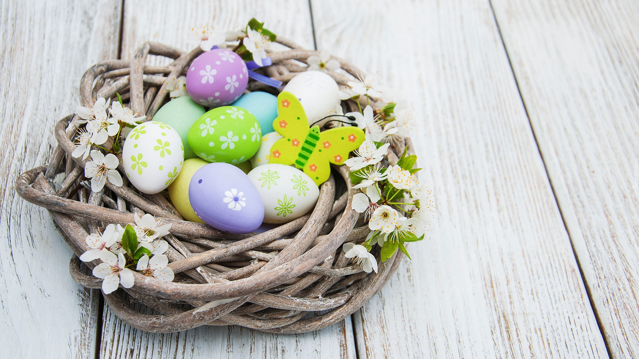Edytor tapety: Pisanki i motyl w gnieździe