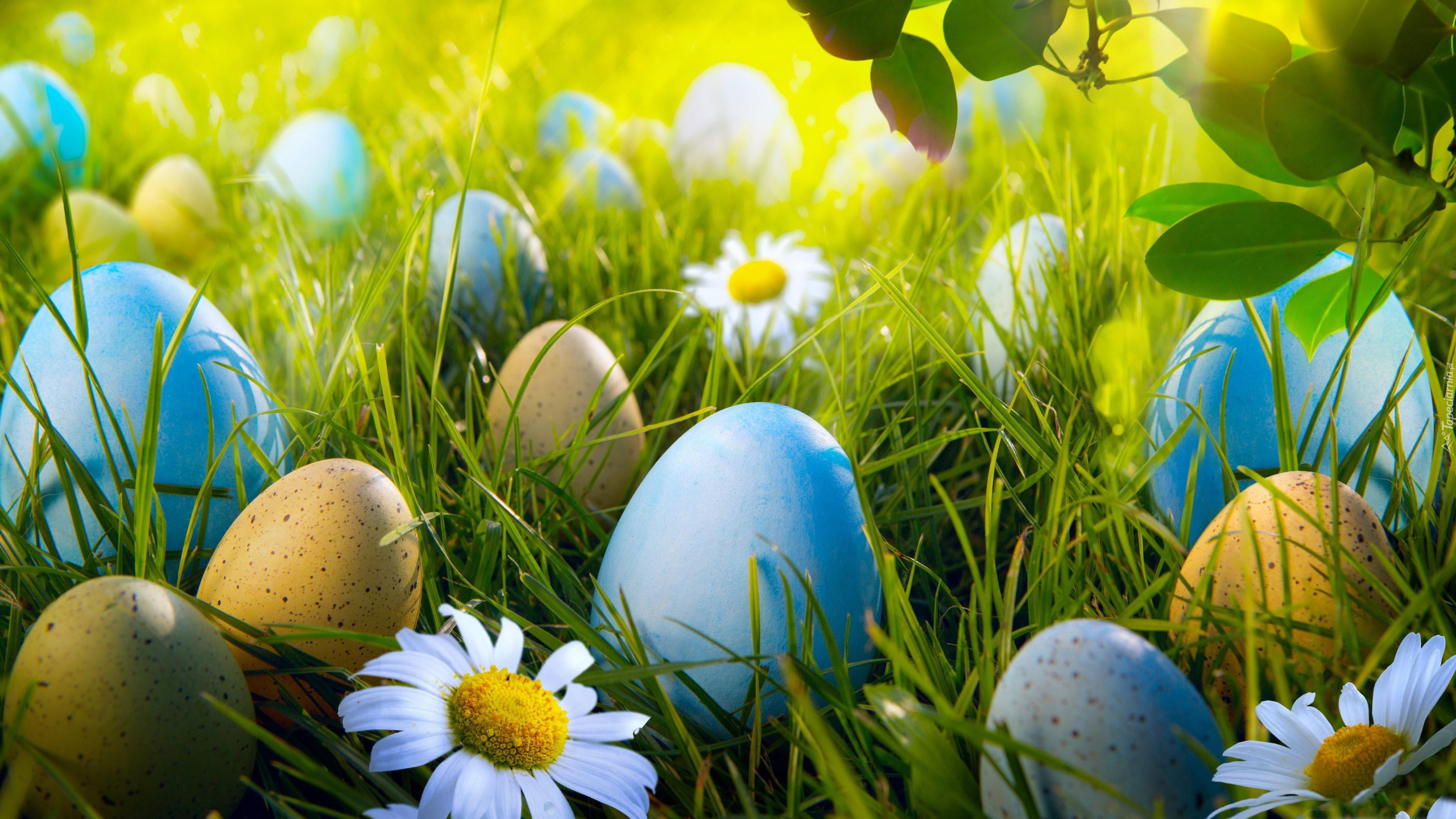 Edytor tapety: Kolorowe pisanki i rumianki w trawie