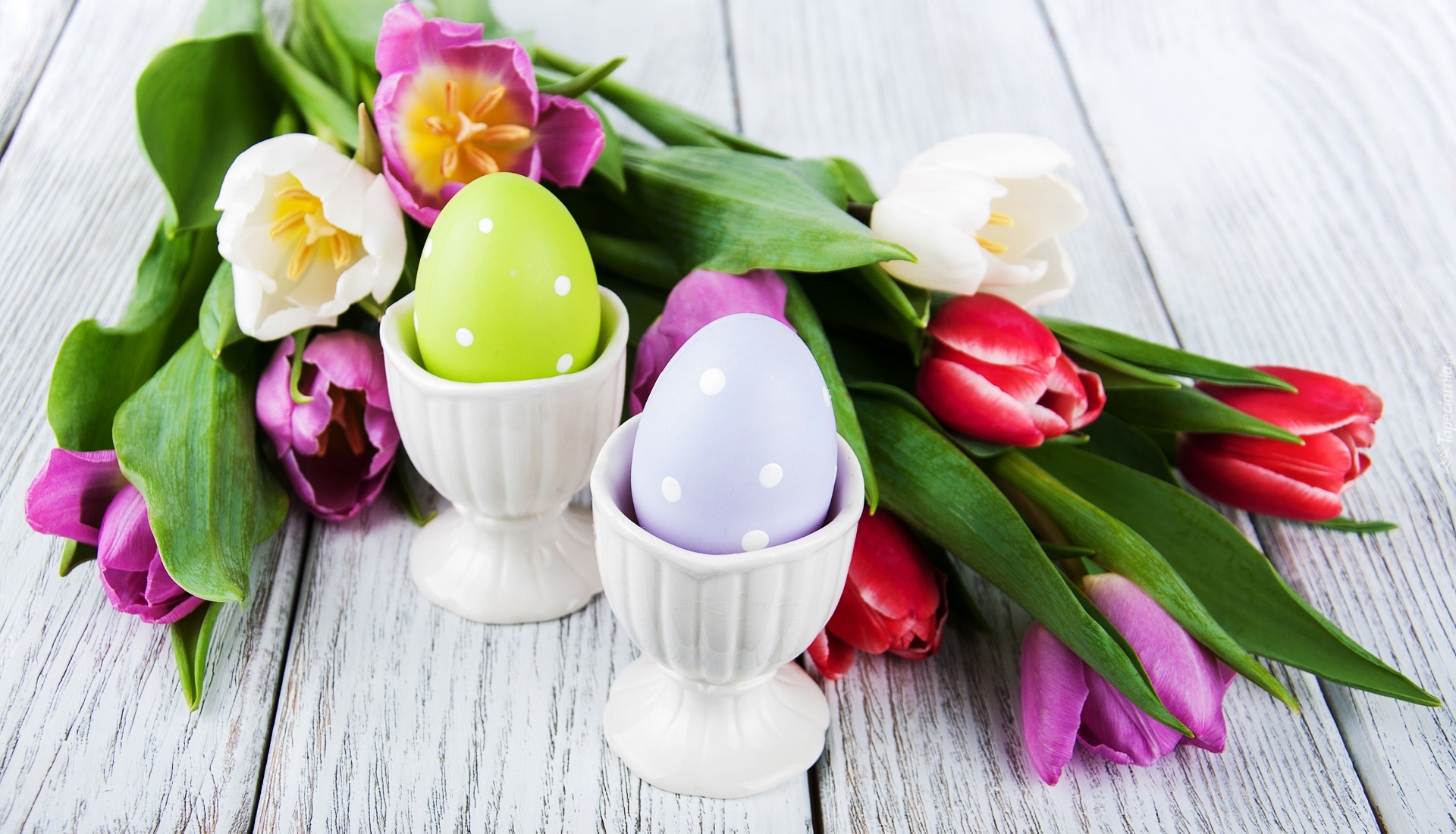 Edytor tapety: Pisanki w kieliszkach obok tulipanów