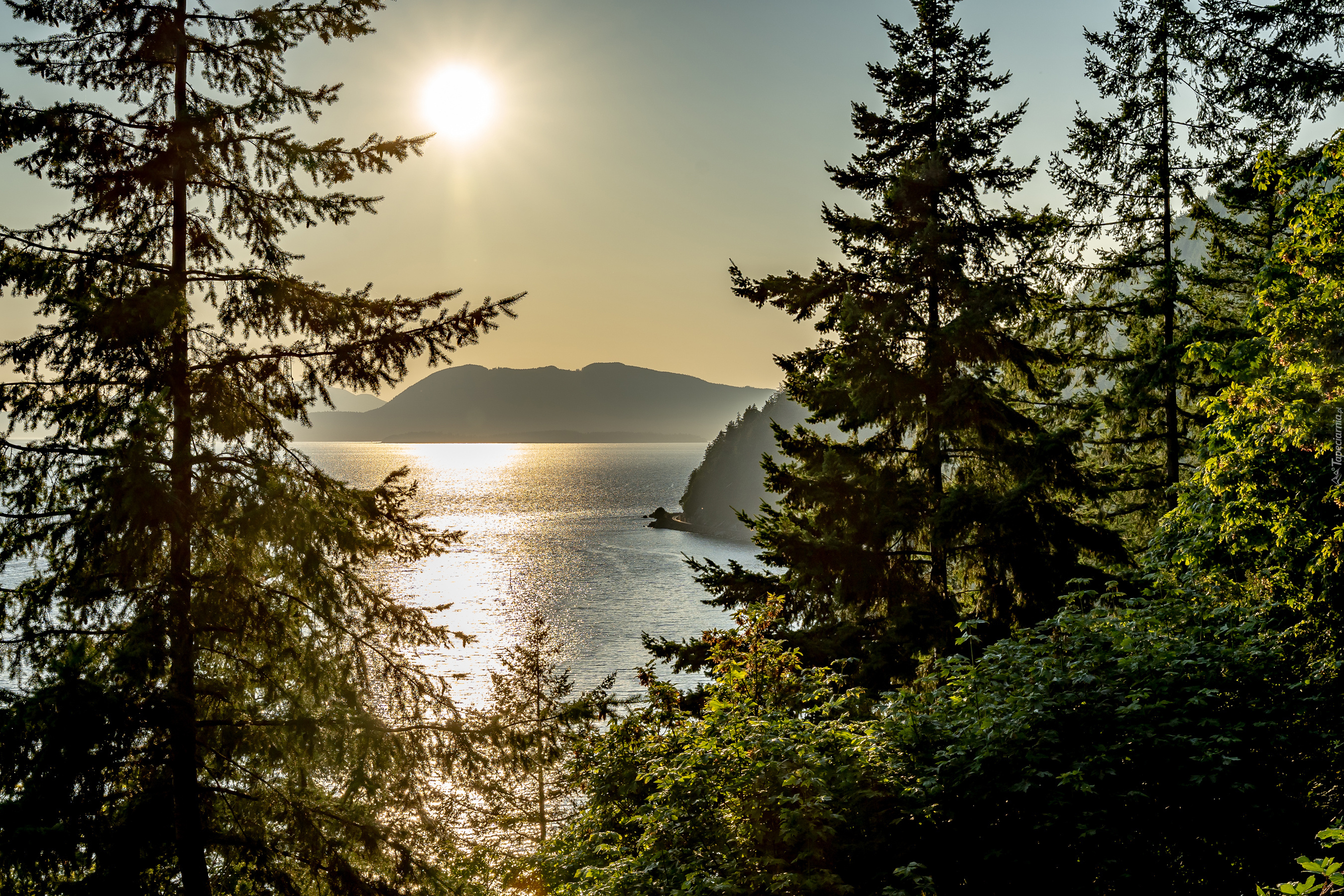 Edytor tapety: Widok zza świerków na jezioro
