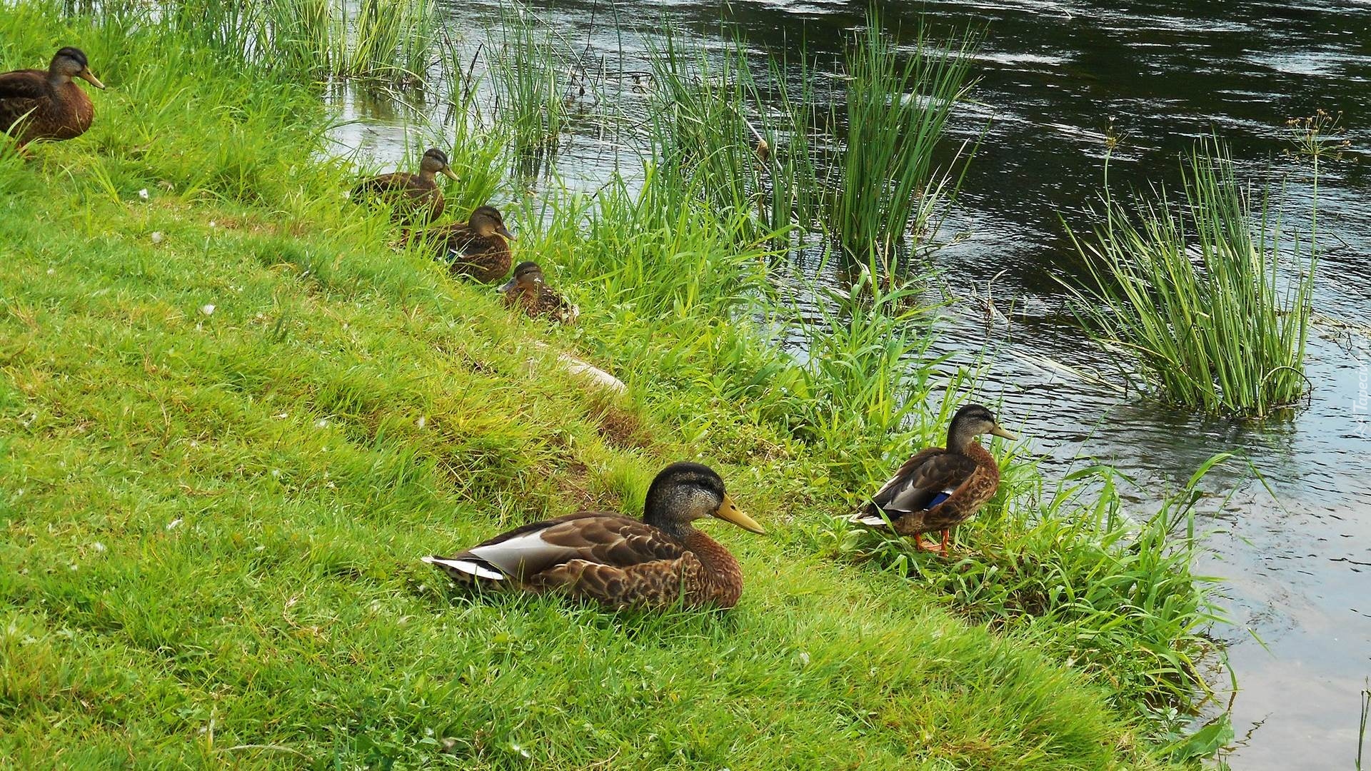 Edytor tapety: Kaczki w trawie nad stawem