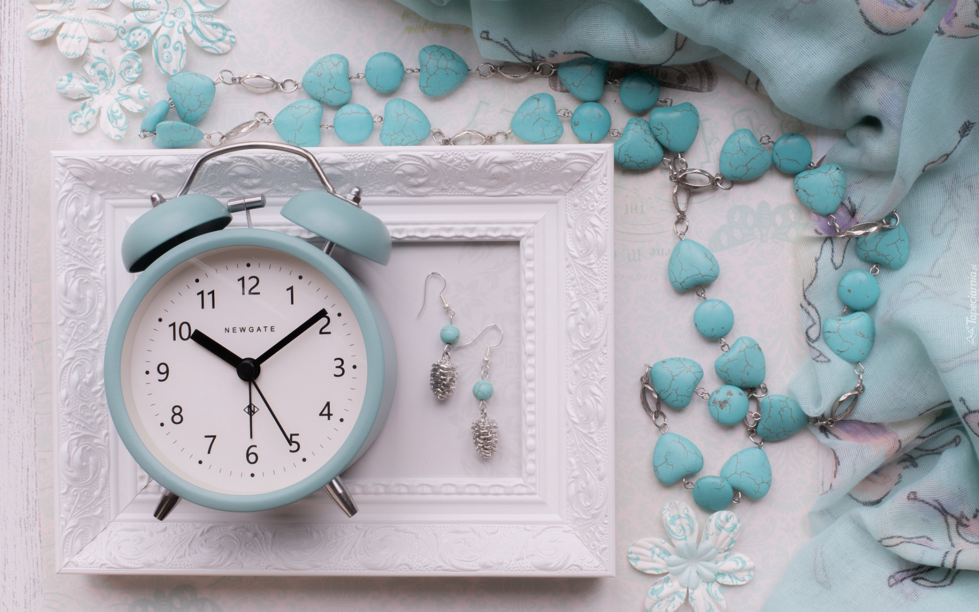 Edytor tapety: Budzik na ramce obok biżuterii