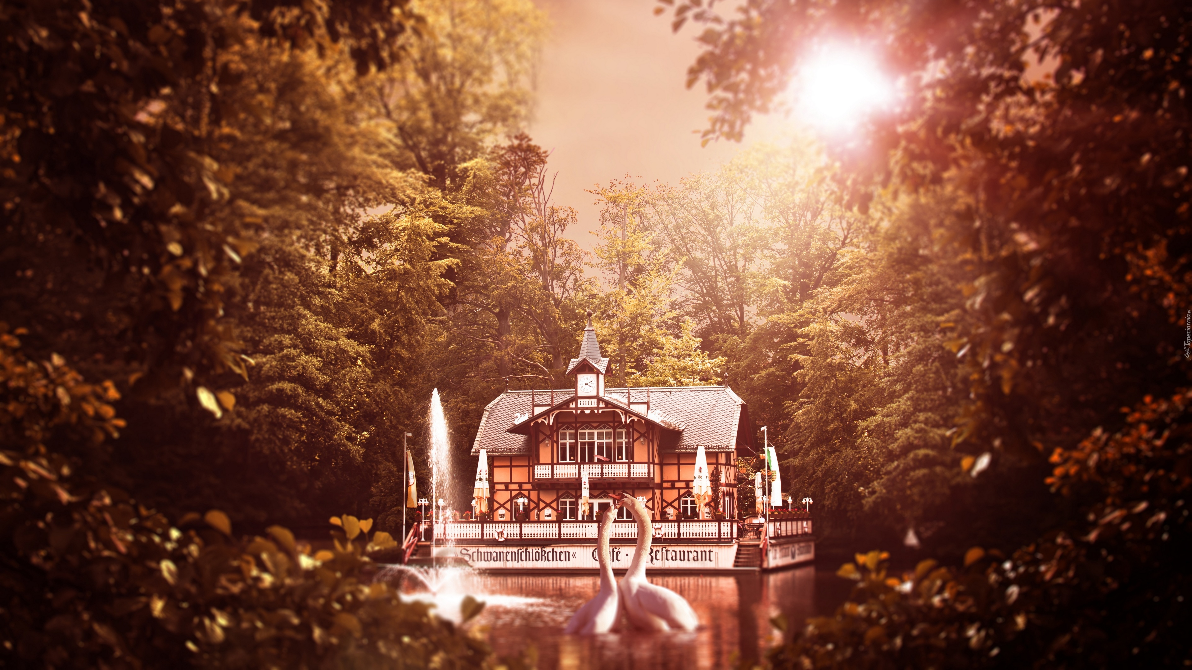 Edytor tapety: Łabędzie na jeziorze z restauracją w tle