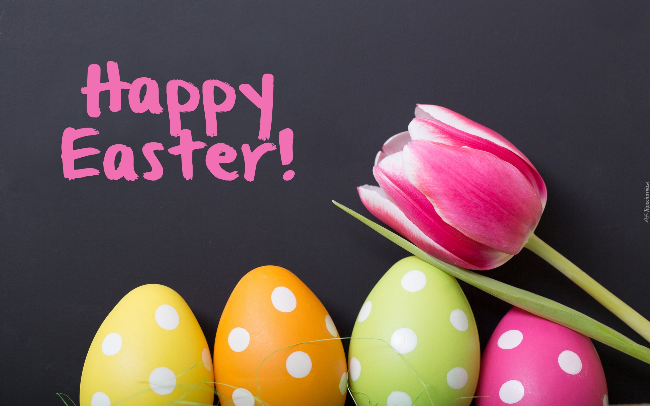 Edytor tapety: Napis Happy Easter nad pisankami i tulipanem