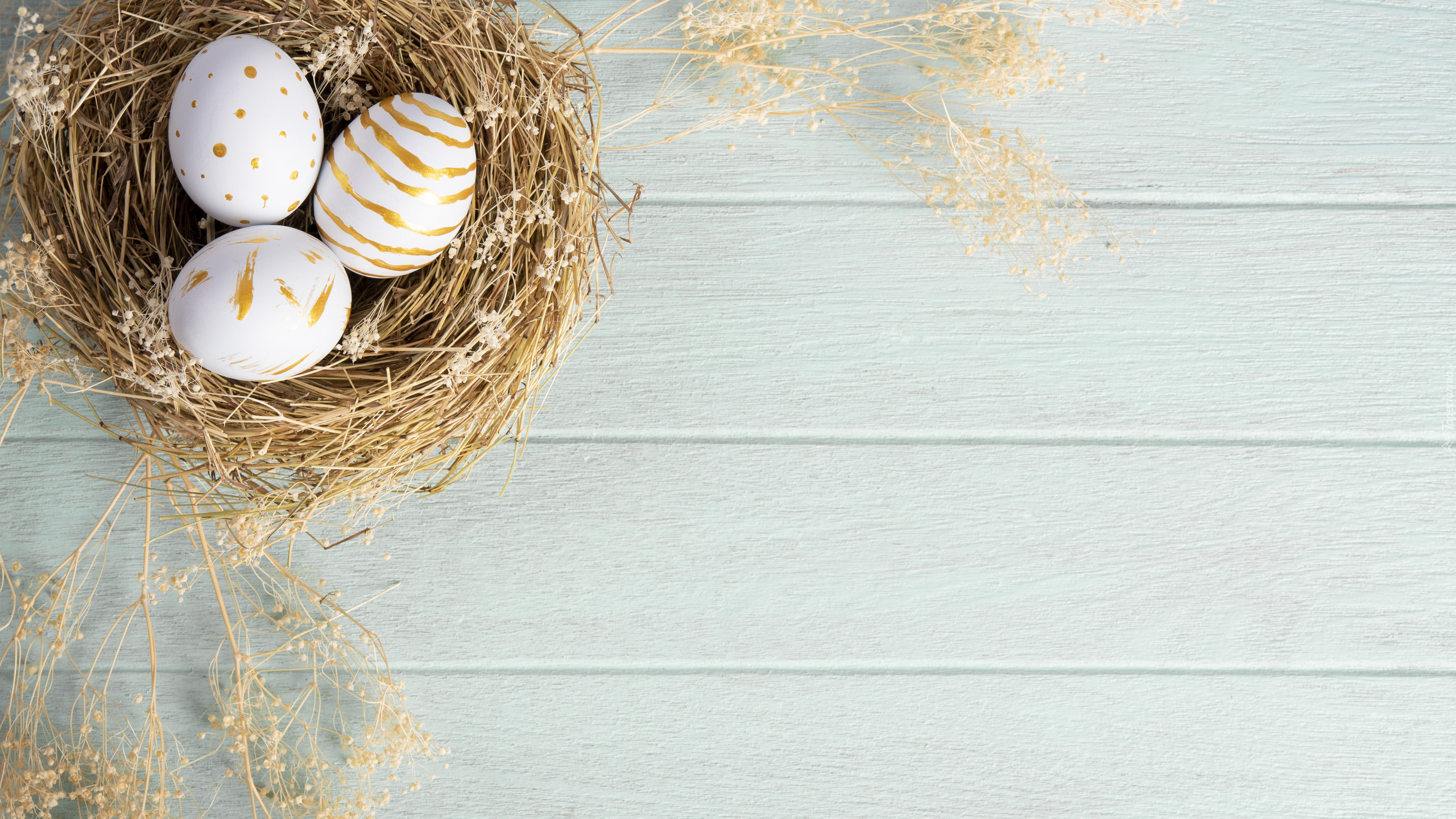 Edytor tapety: Trzy pisanki w gnieździe na deskach