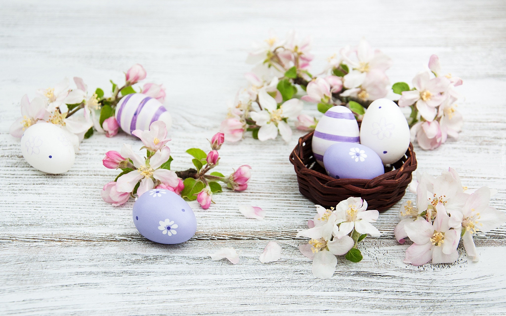 Edytor tapety: Koszyczek z pisankami pośród kwiatów drzewa owocowego
