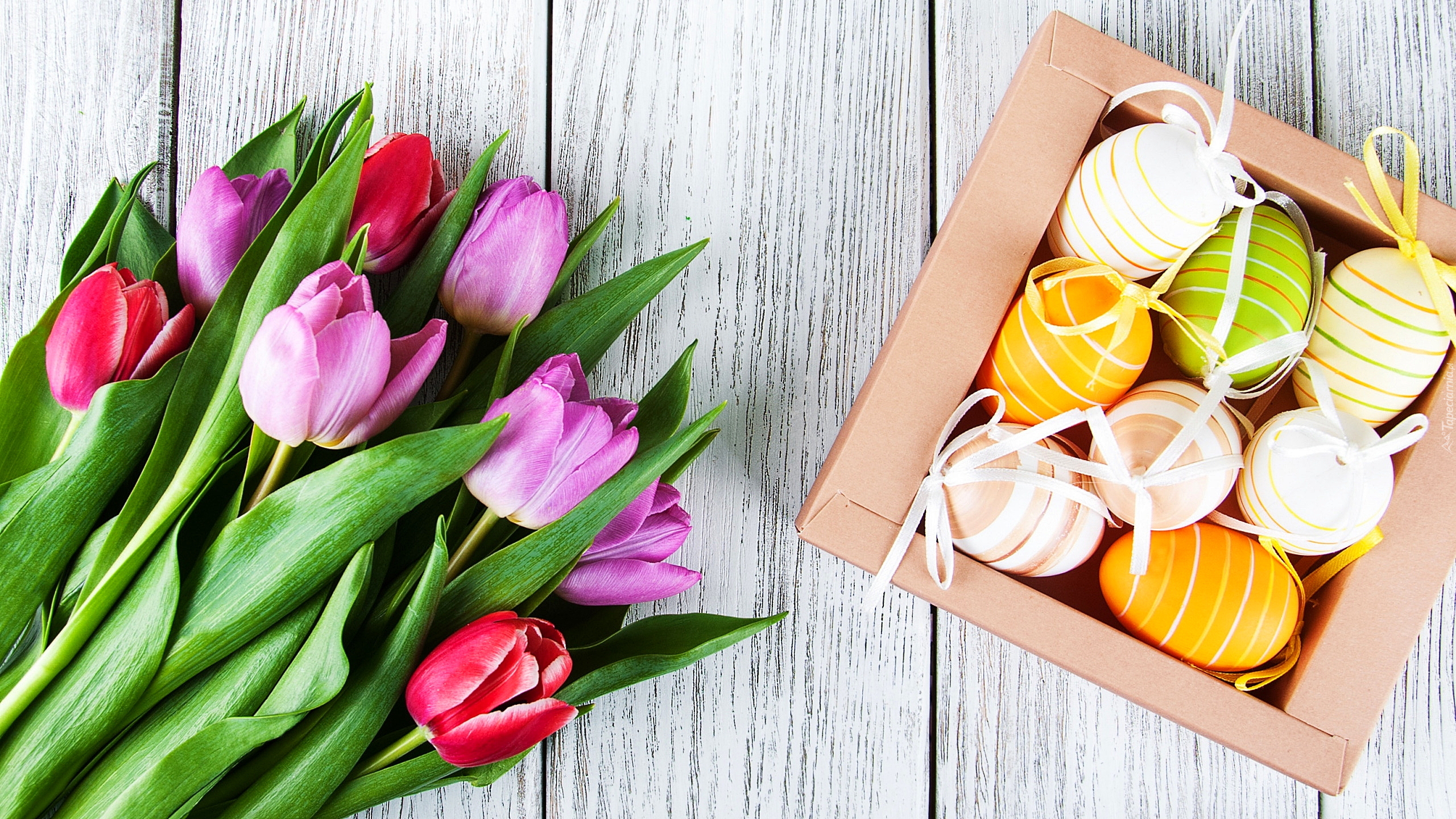Edytor tapety: Tulipany obok pisanek w pudełku