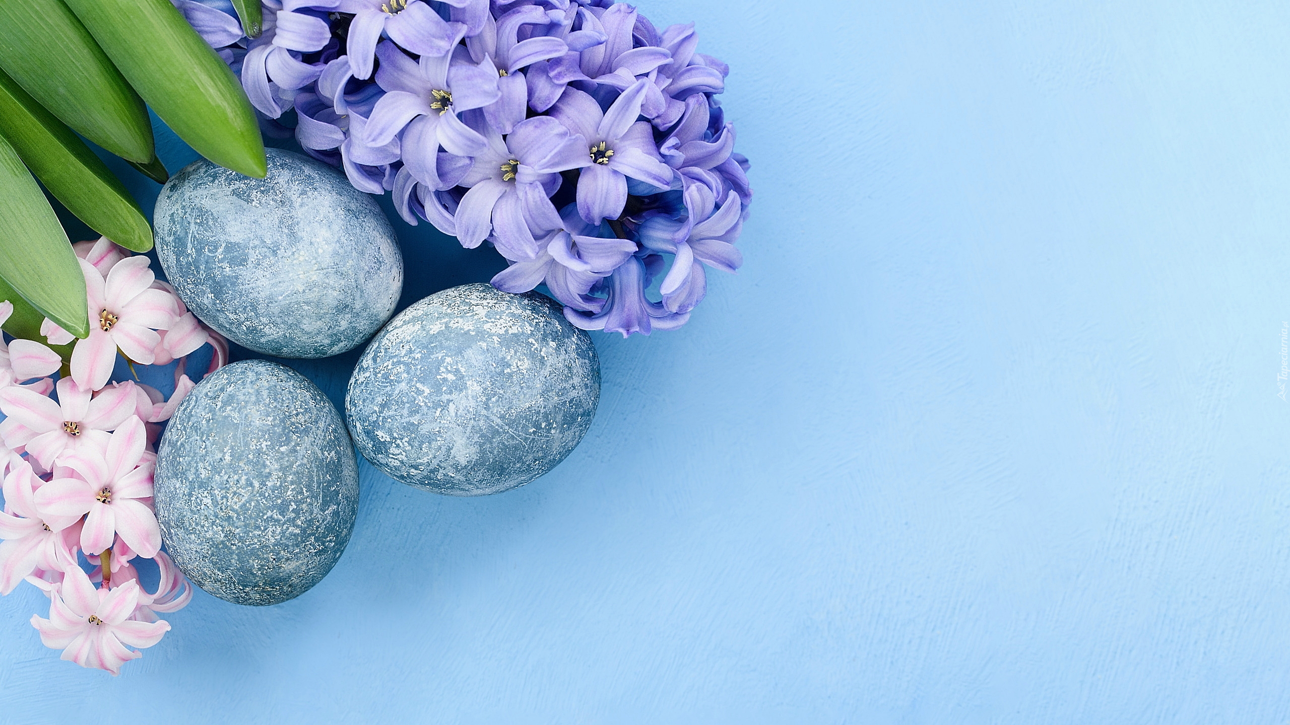 Edytor tapety: Pisanki obok hiacyntów na niebieskim tle