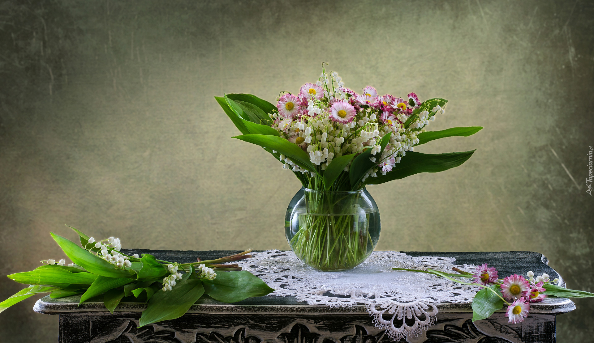 Edytor tapety: Konwalie i stokrotki w wazonie na stole