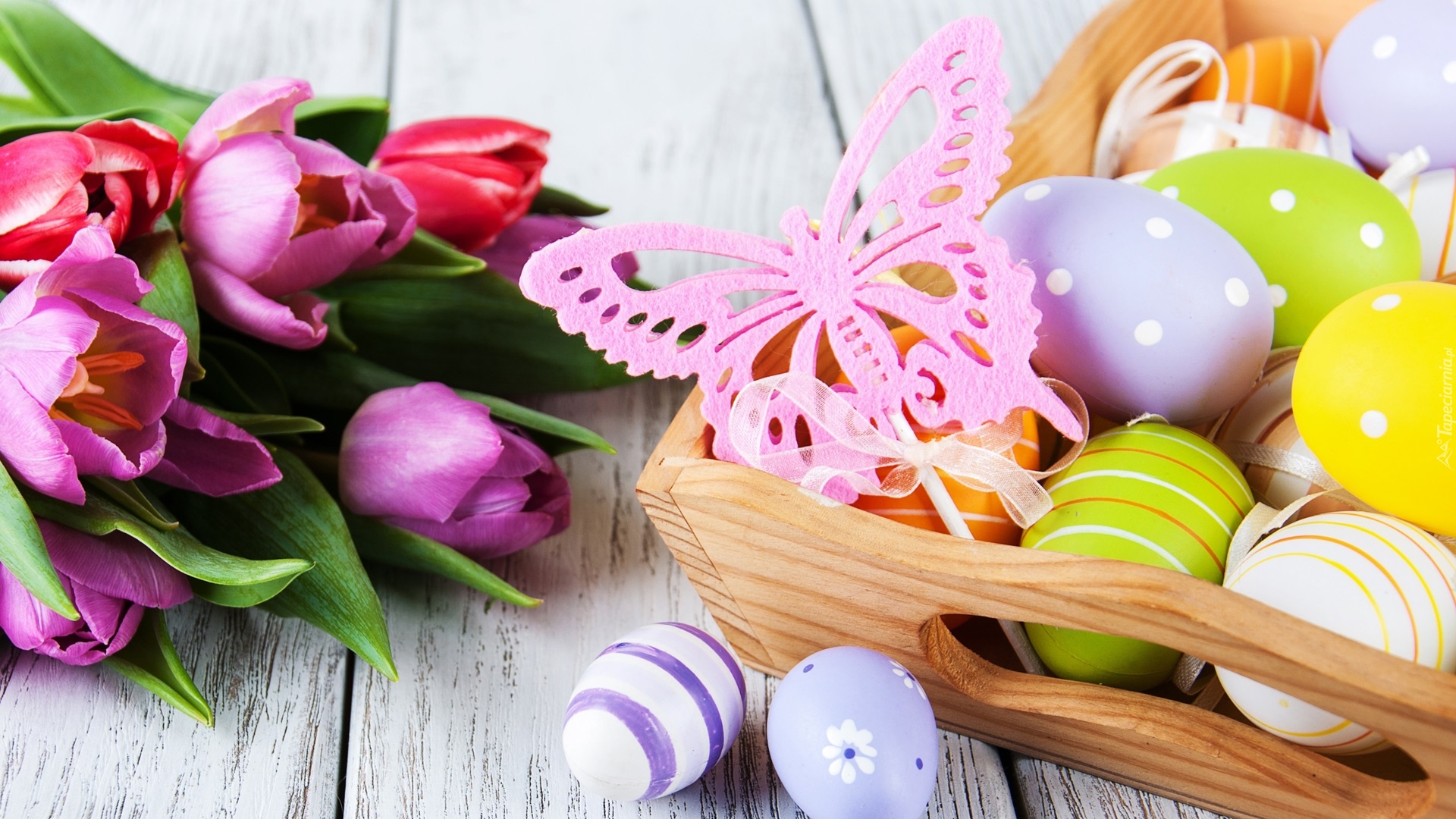 Edytor tapety: Tulipany i pisanki w skrzynce