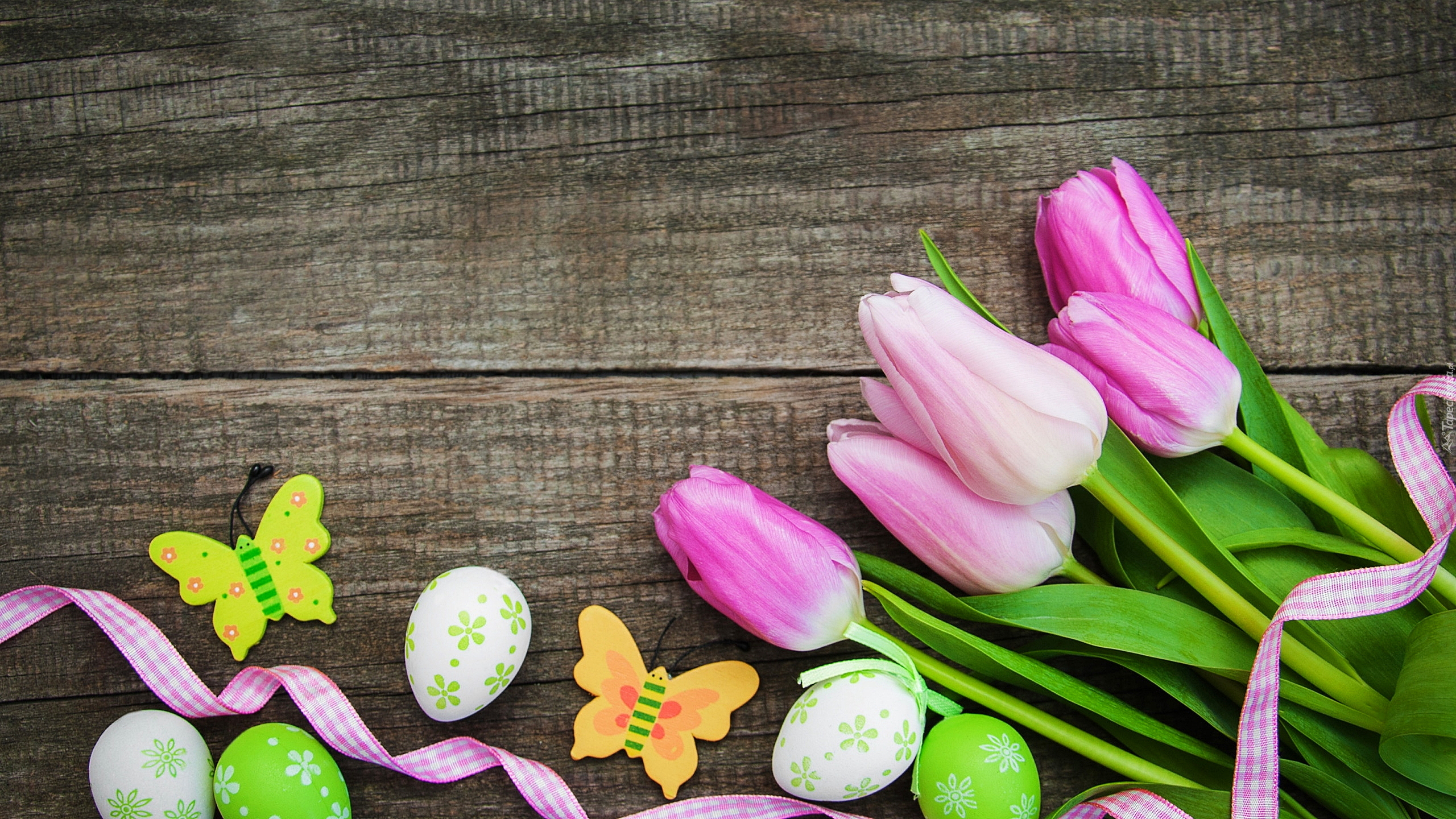 Edytor tapety: Motyle i pisanki obok różowych tulipanów