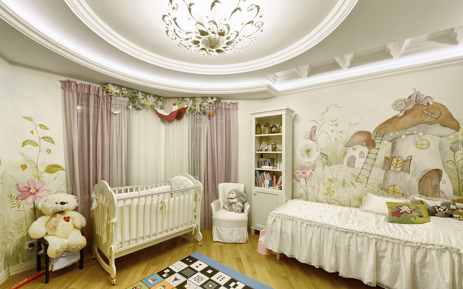Edytor tapety: Pluszaki na fotelach obok łóżeczka w pokoju dziecięcym