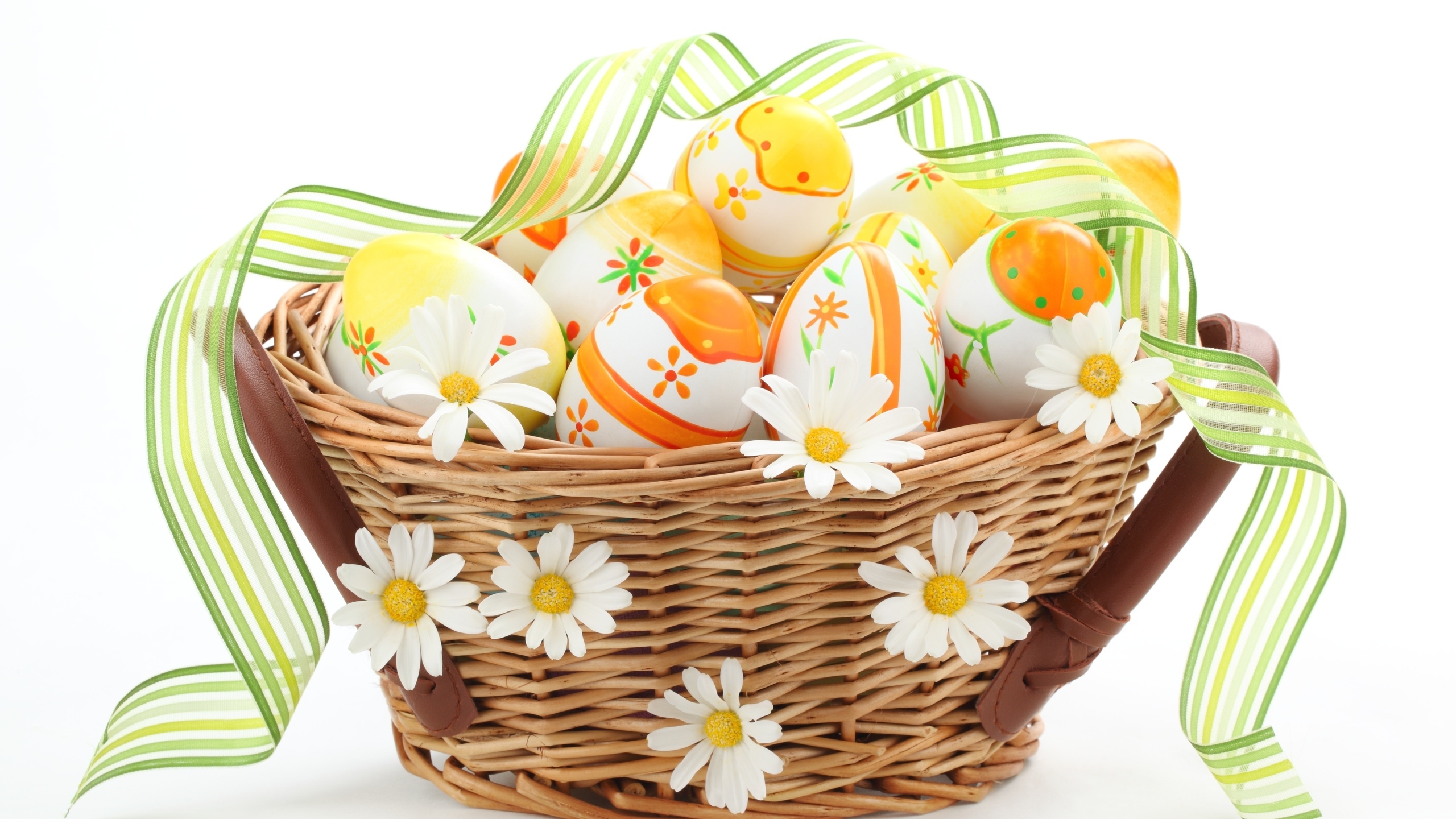 Edytor tapety: Koszyk z pisankami ozdobiony wstążką i kwiatkami