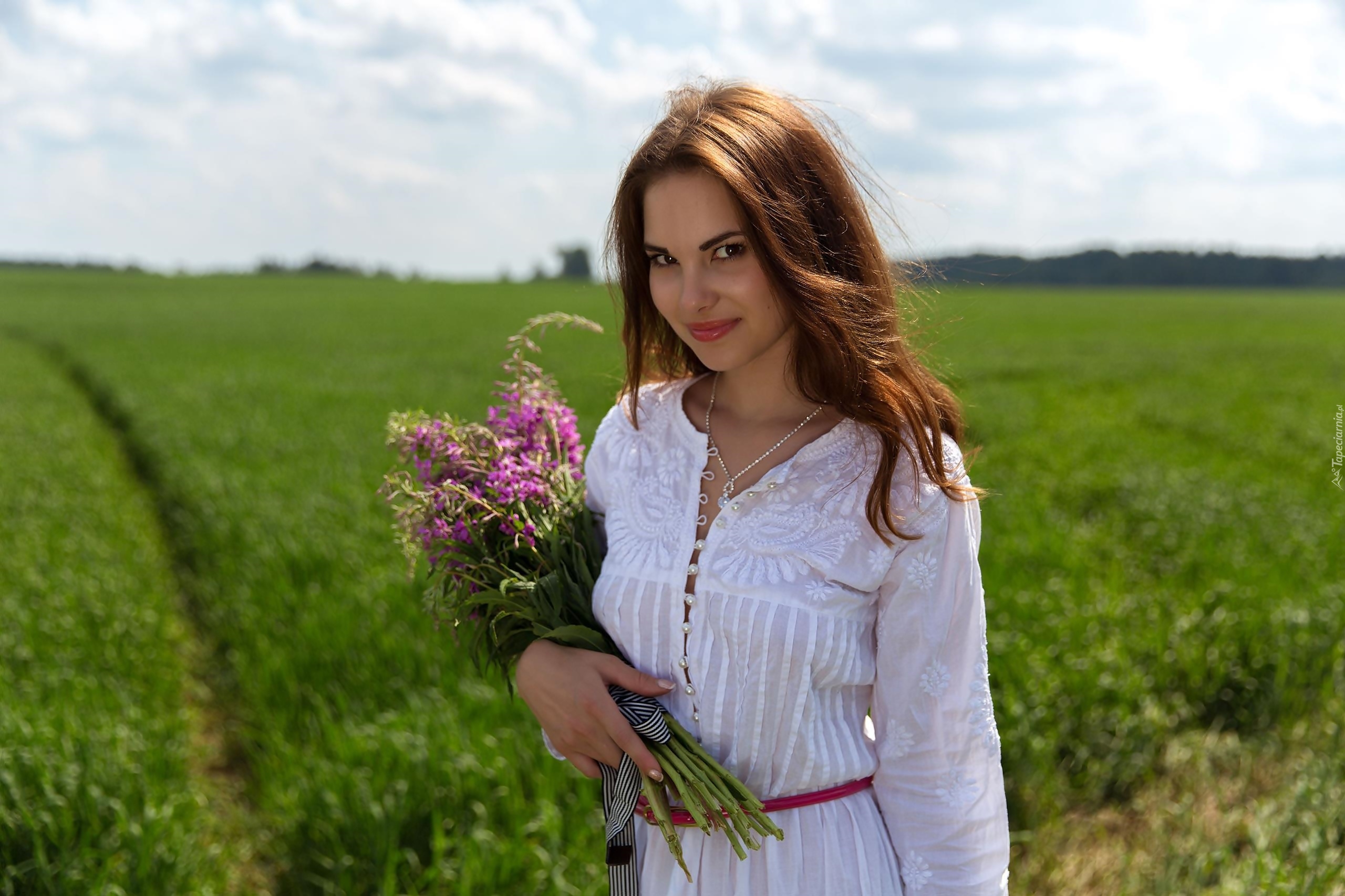 Edytor tapety: Kobieta z bukietem polnych kwiatów