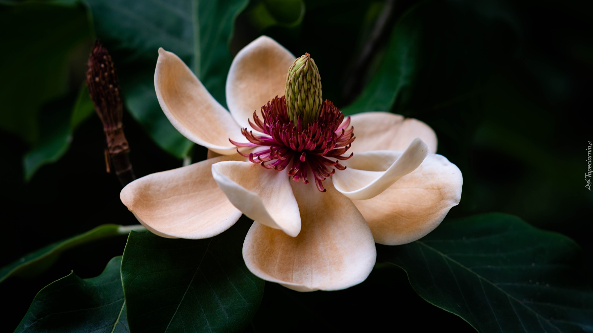 Edytor tapety: Rozkwitnięta magnolia z liśćmi