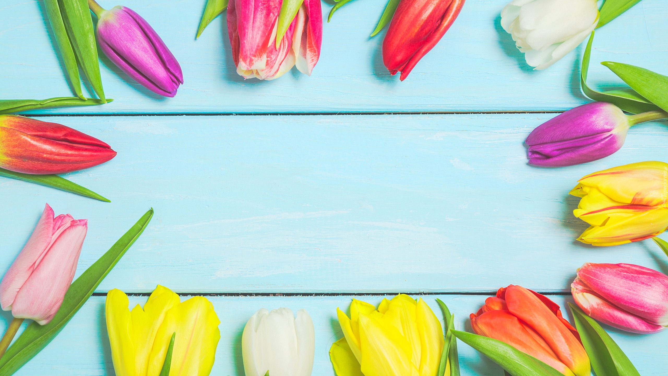 Edytor tapety: Kolorowe pąki tulipanów na niebieskich deskach