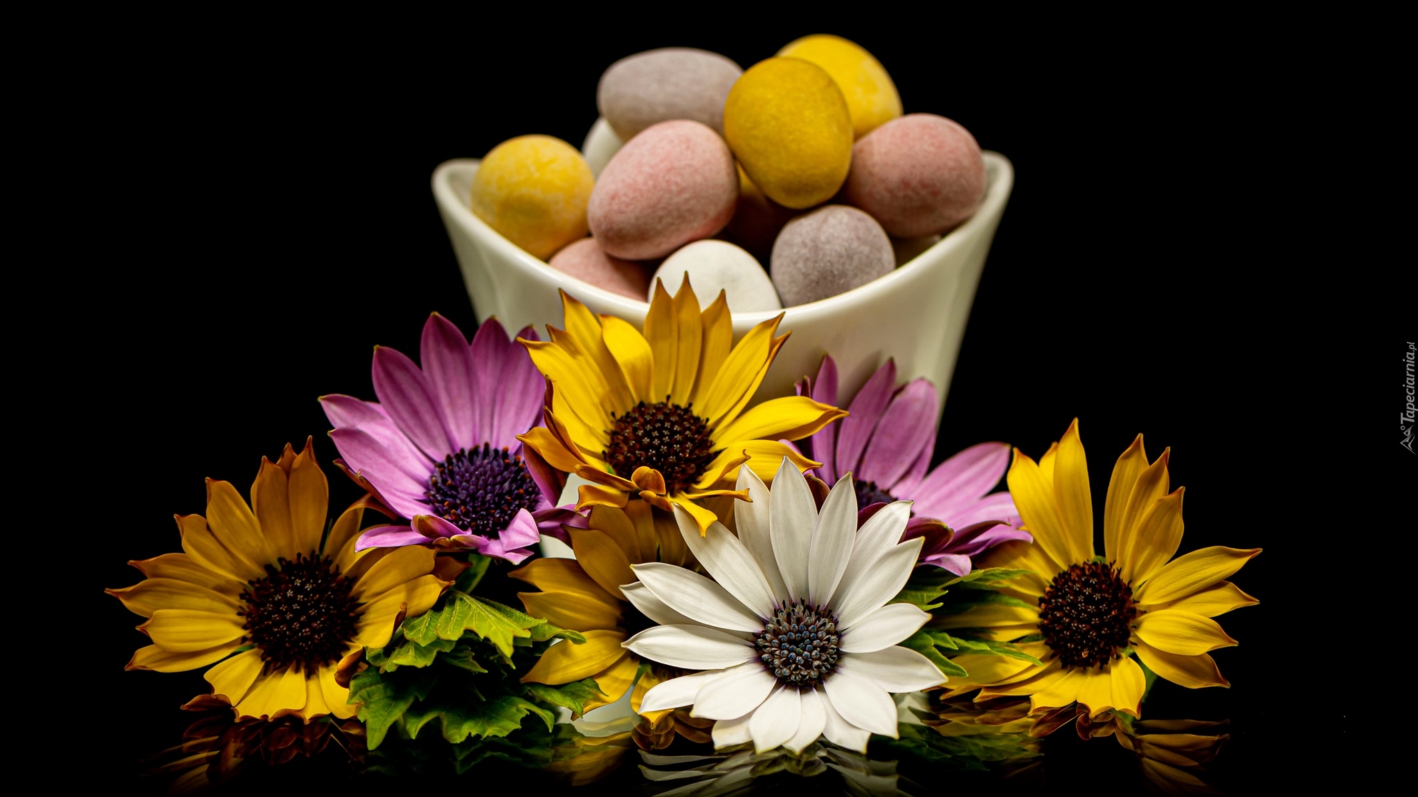 Edytor tapety: Stokrotki afrykańskie obok miseczki z jajeczkami