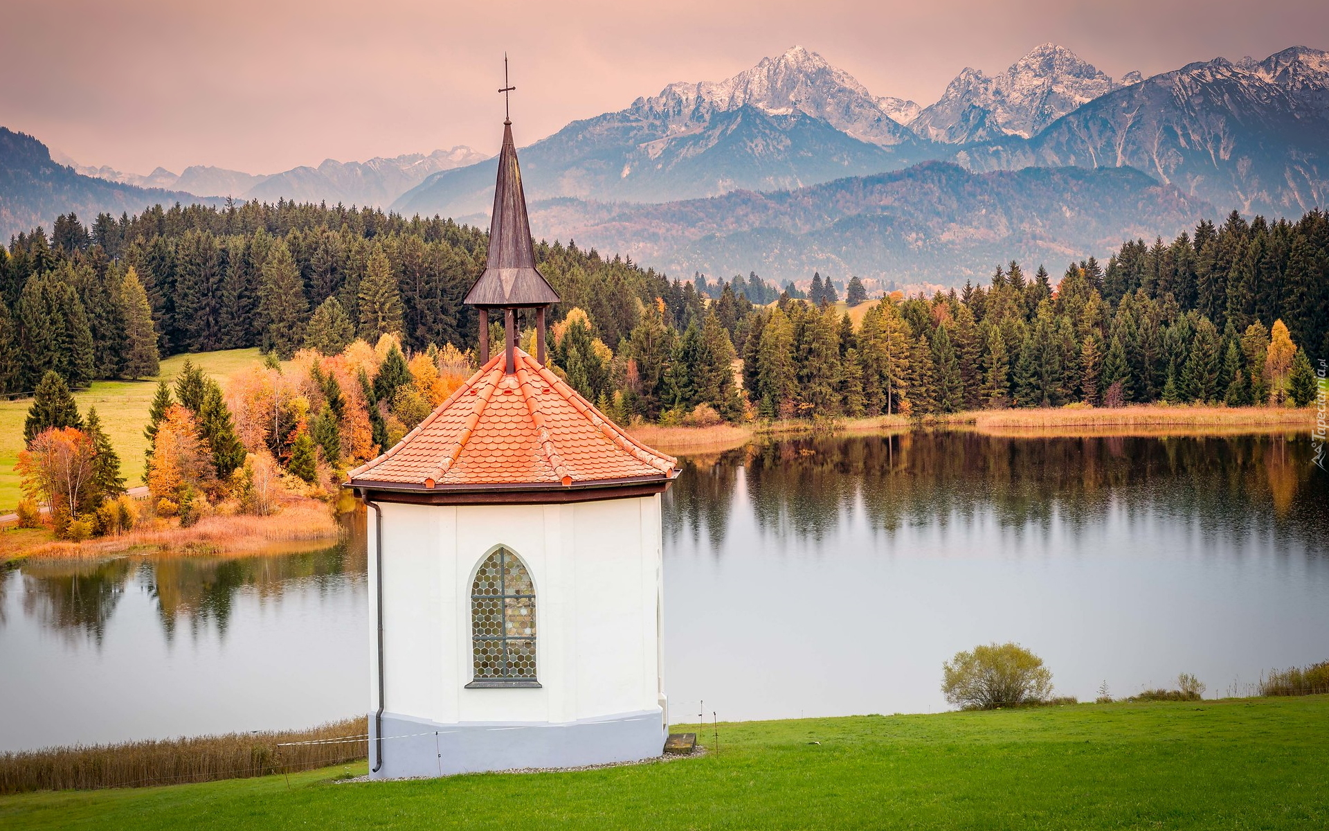 Edytor tapety: Kaplica w Halblech na tle jeziora Hegratsried