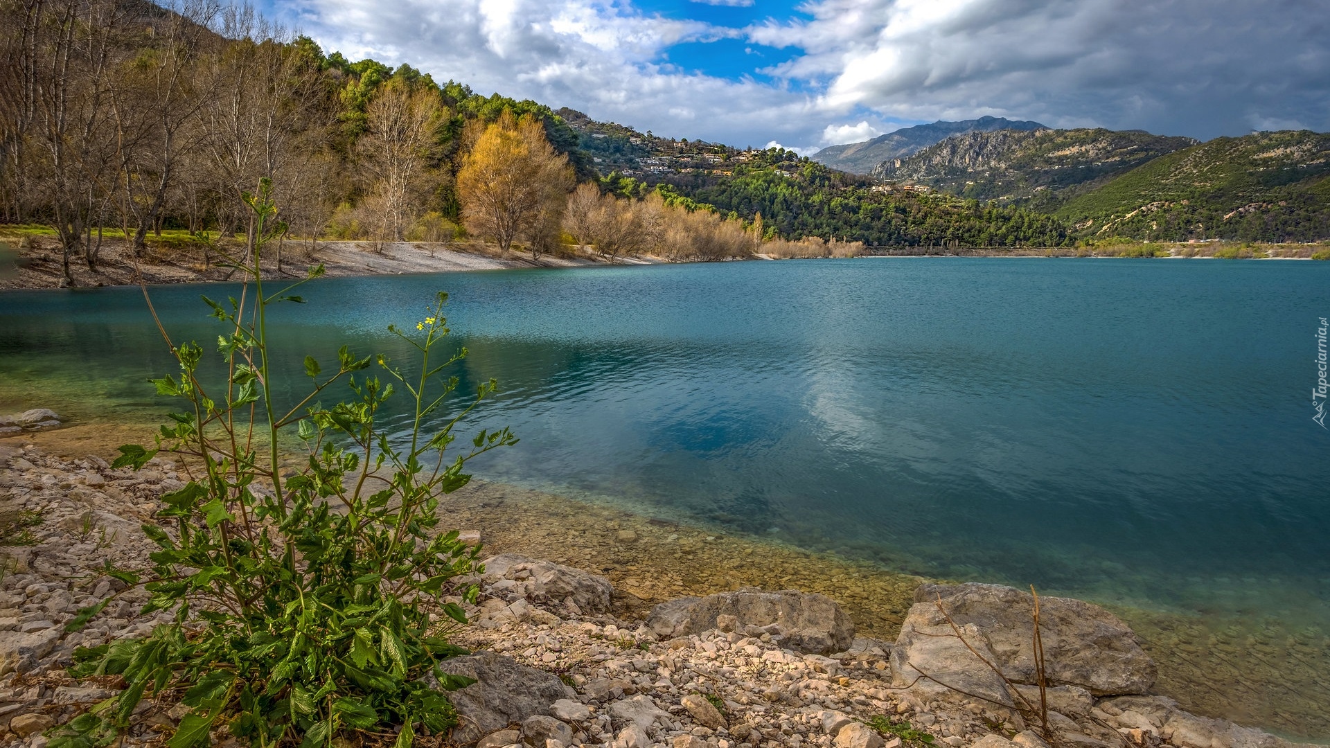 Edytor tapety: Roślinka na kamieniach nad brzegiem jeziora