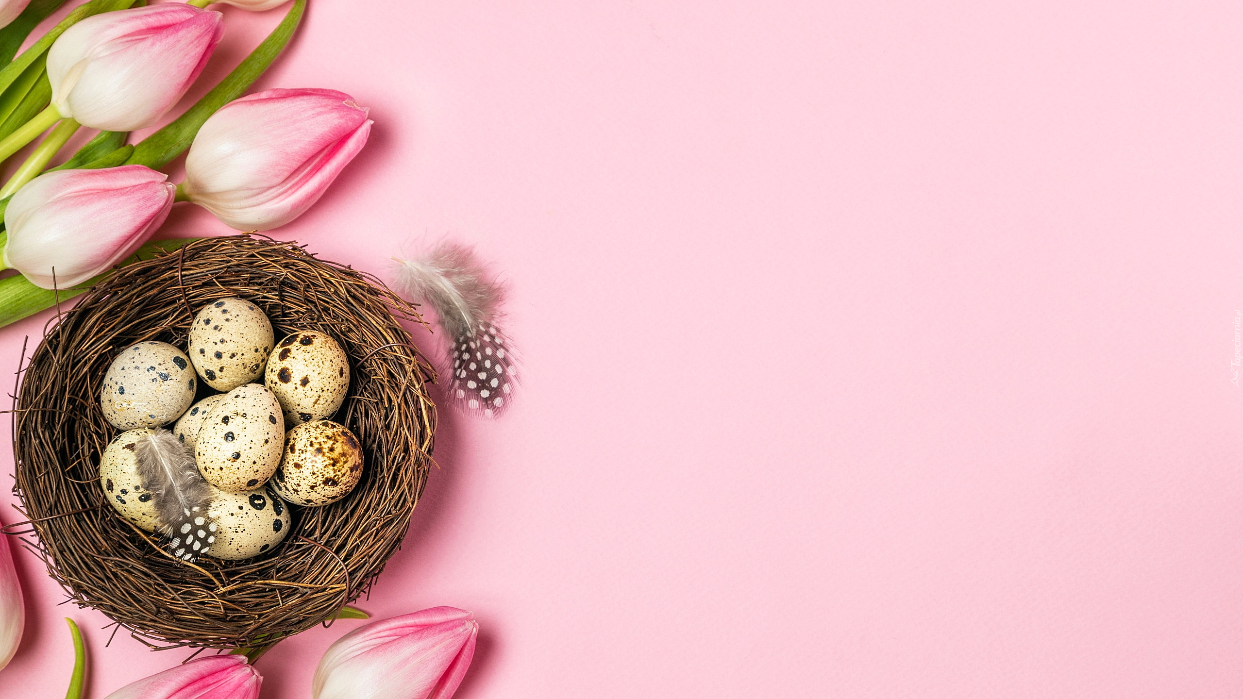 Edytor tapety: Tulipany obok pisanek w gniazdku na różowym tle