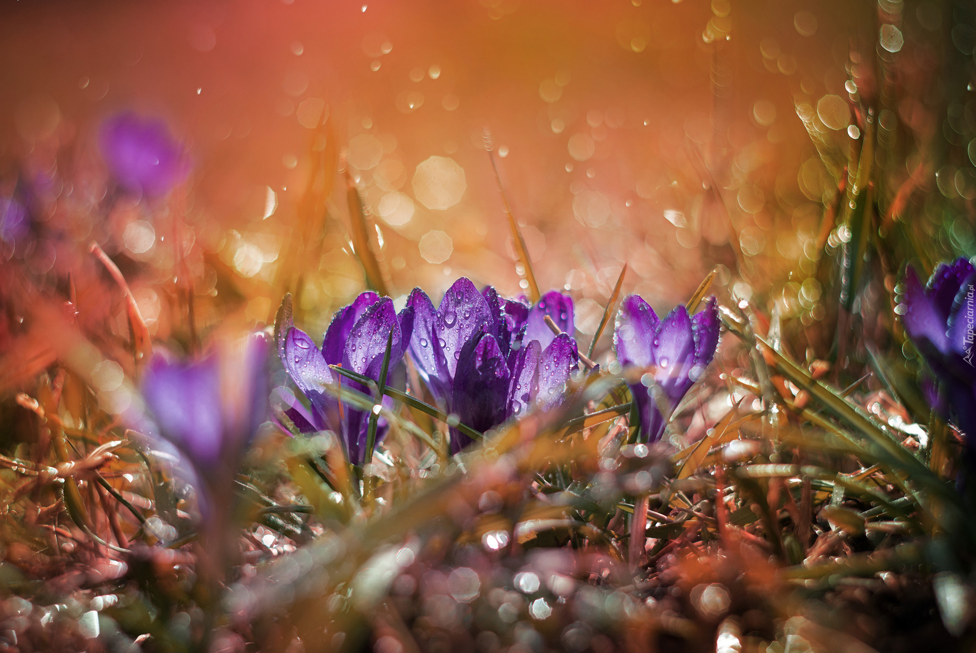 Edytor tapety: Fioletowe krokusy w kroplach wody