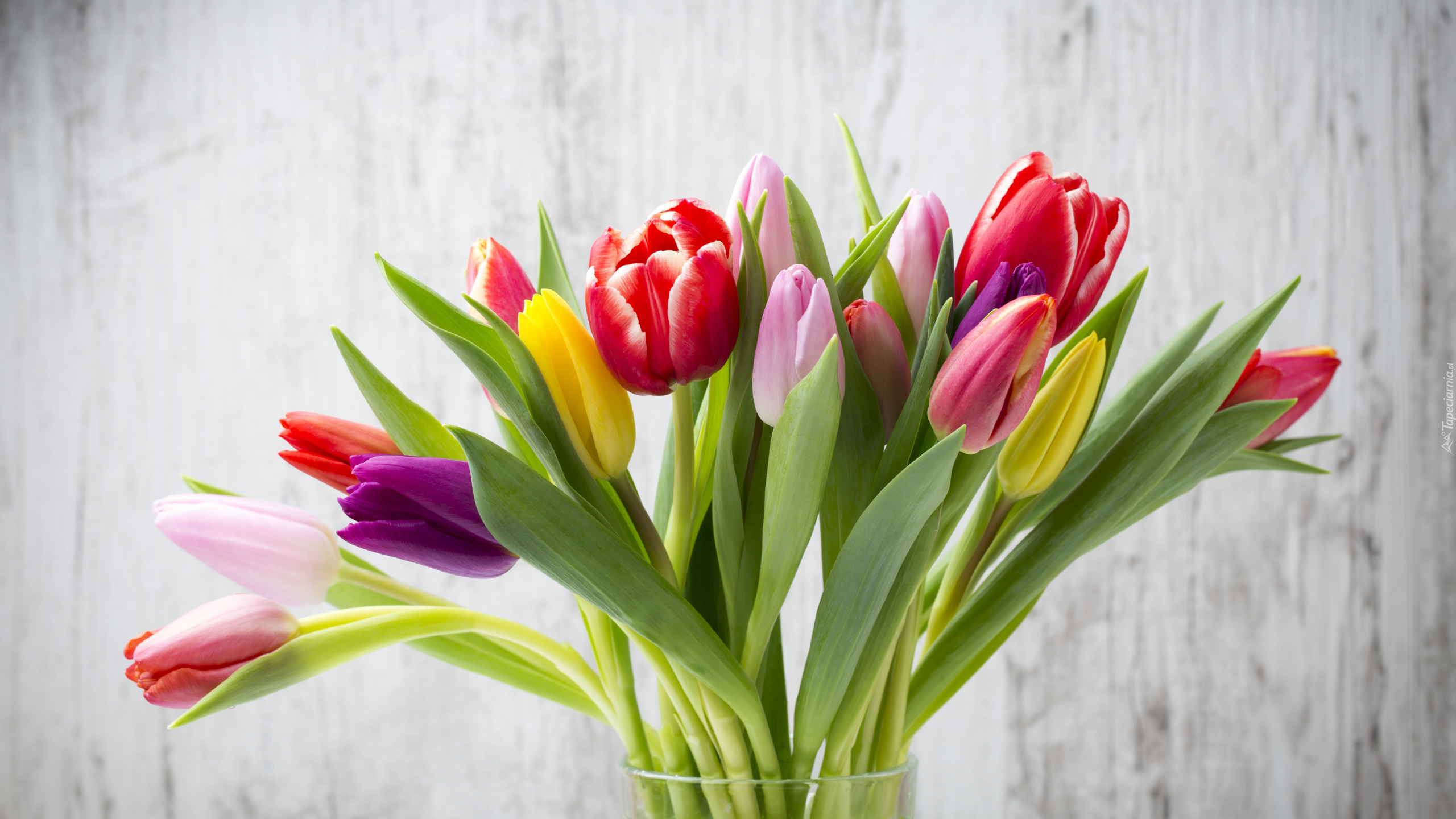 Edytor tapety: Bukiet kolorowych tulipanów w szklanym wazonie