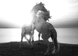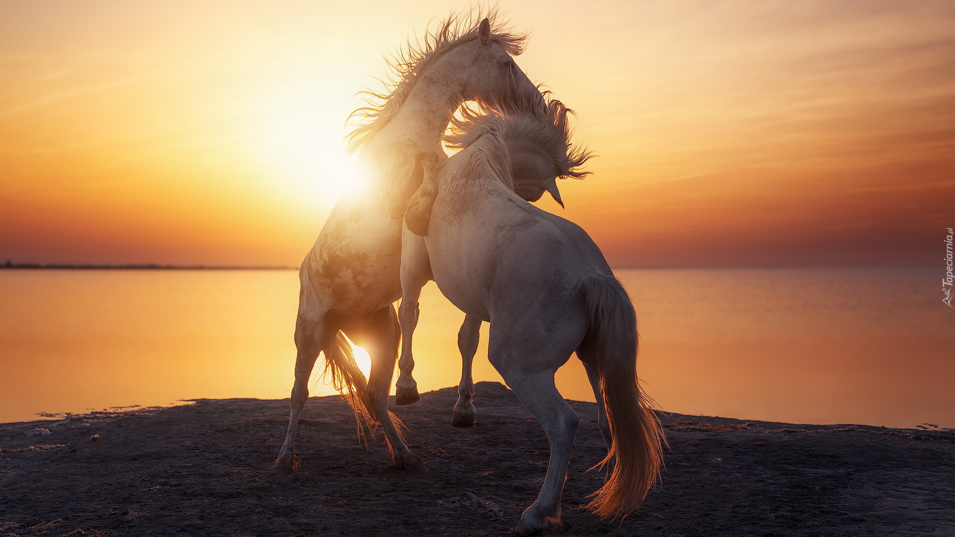 Edytor tapety: Dwa konie o zachodzie słońca nad morzem