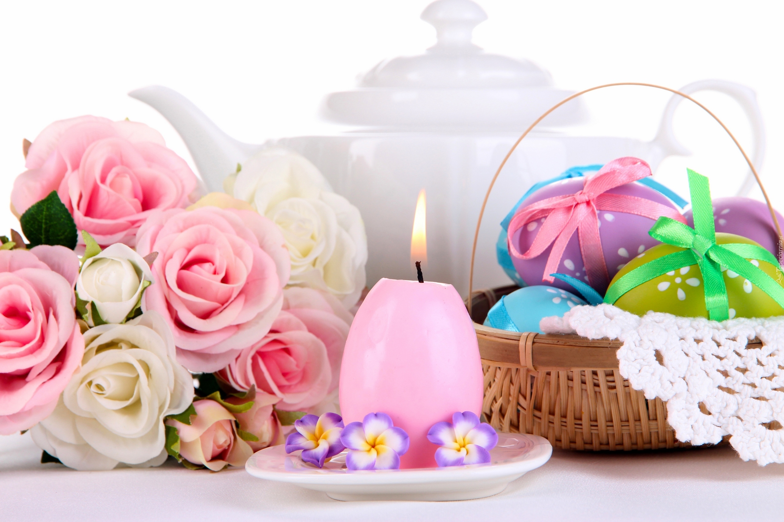 Edytor tapety: Pisanki w koszyczku obok świecy i róż