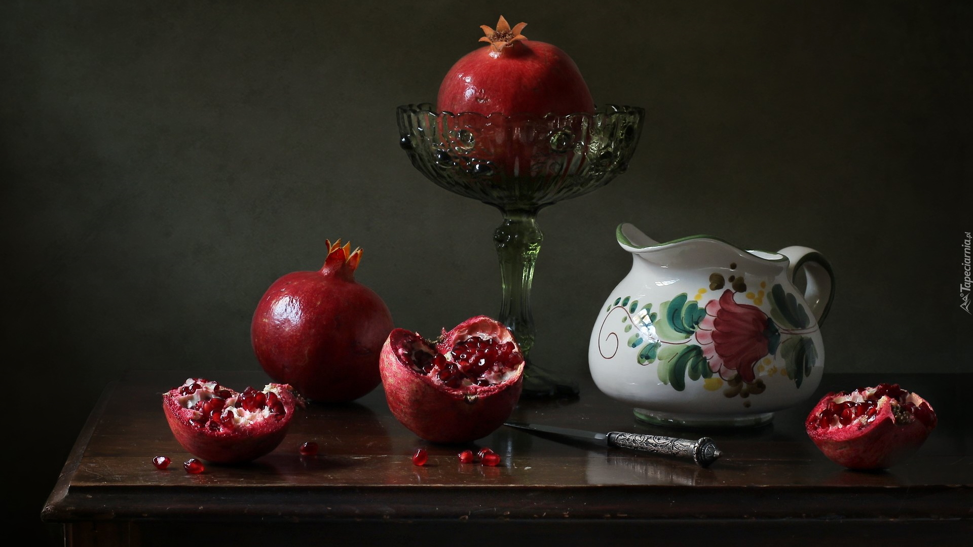 Edytor tapety: Granaty na stole i paterze obok malowanego dzbanuszka