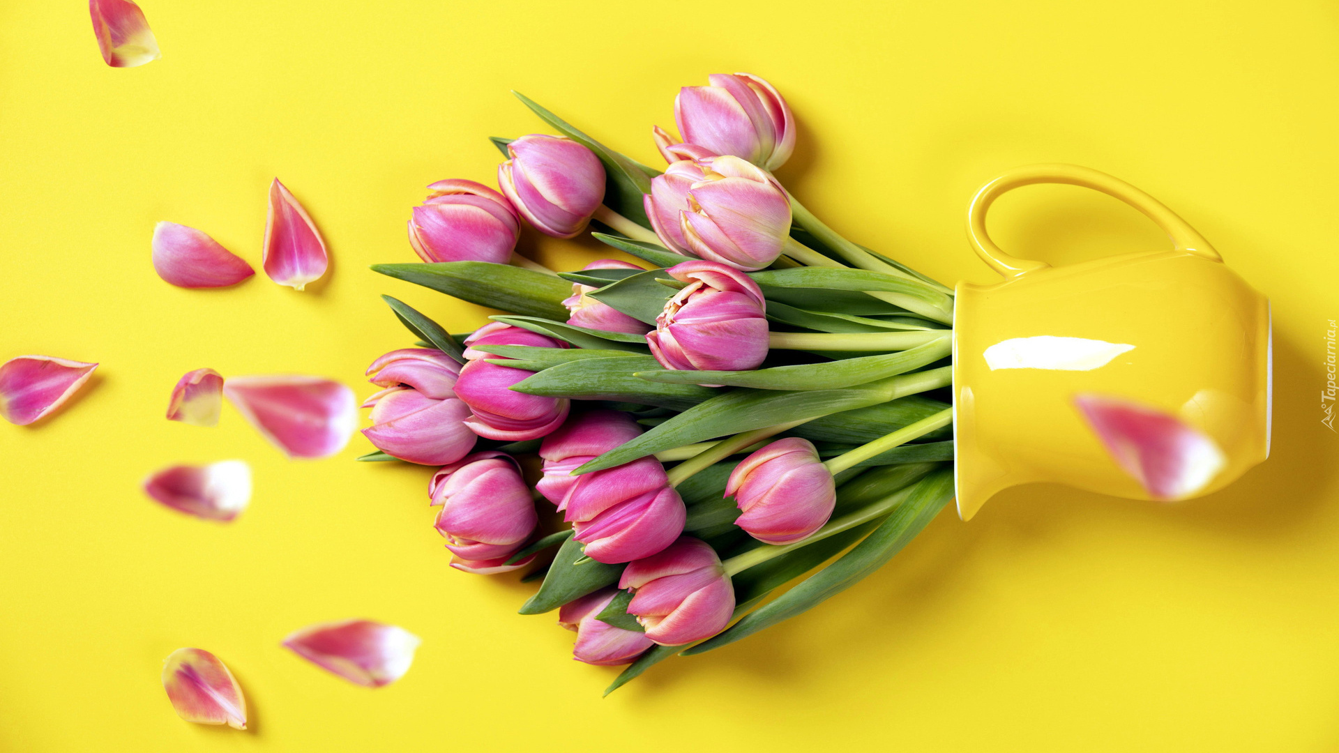 Edytor tapety: Leżące różowe tulipany w żółtym dzbanku