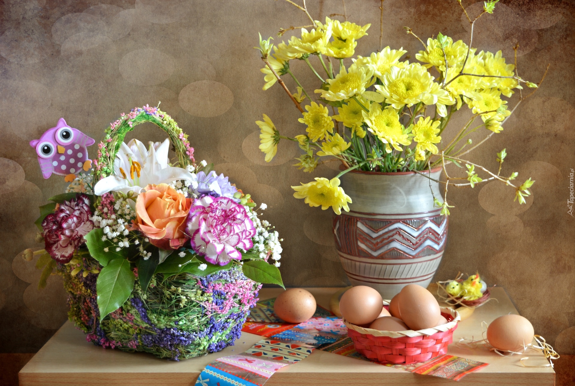 Edytor tapety: Kwiaty w koszyku i wazonie obok jajek