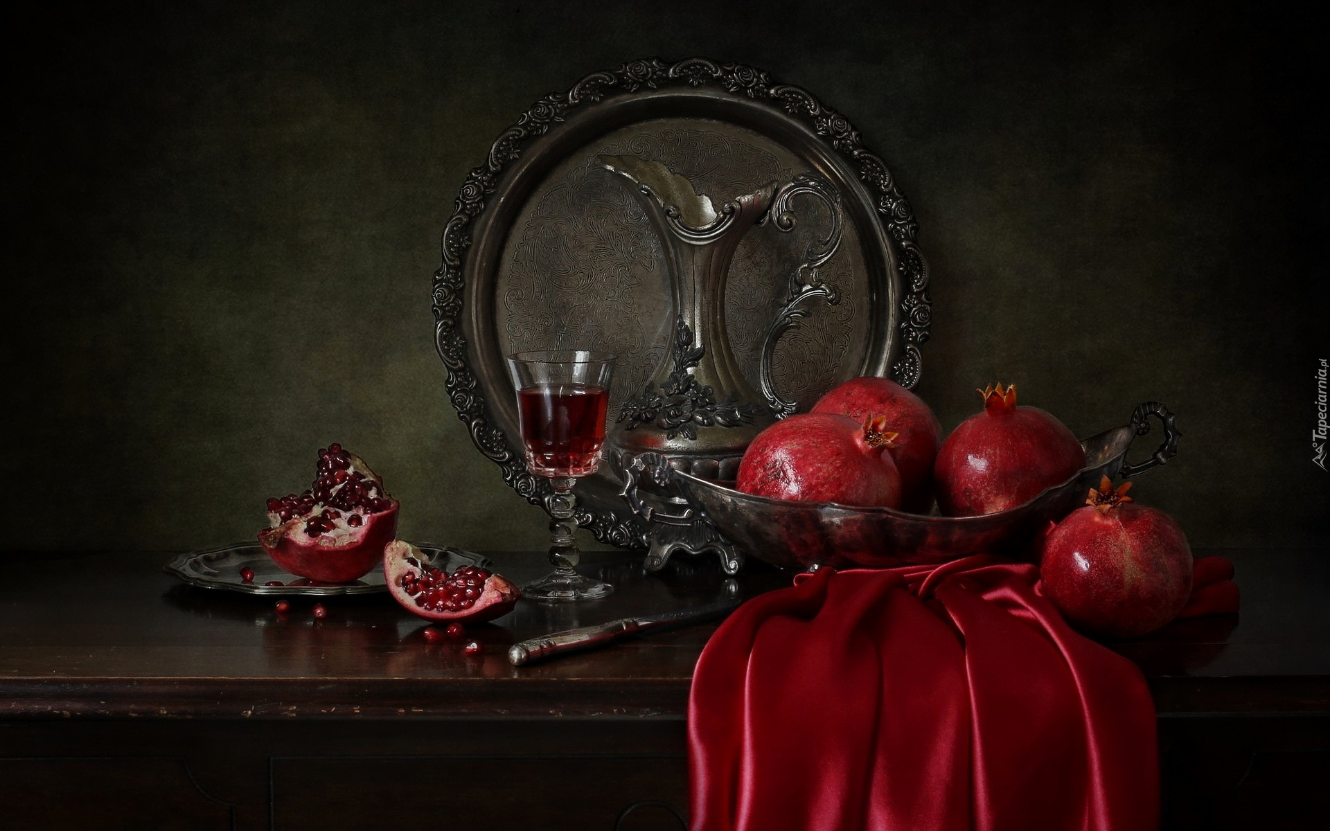 Edytor tapety: Granaty w misce obok ozdobnego dzbanka i kieliszka