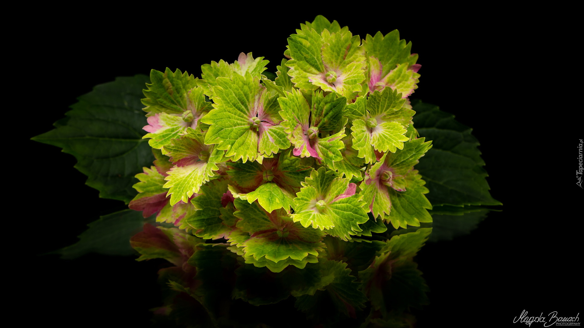 Edytor tapety: Zielona hortensja na czarnym tle