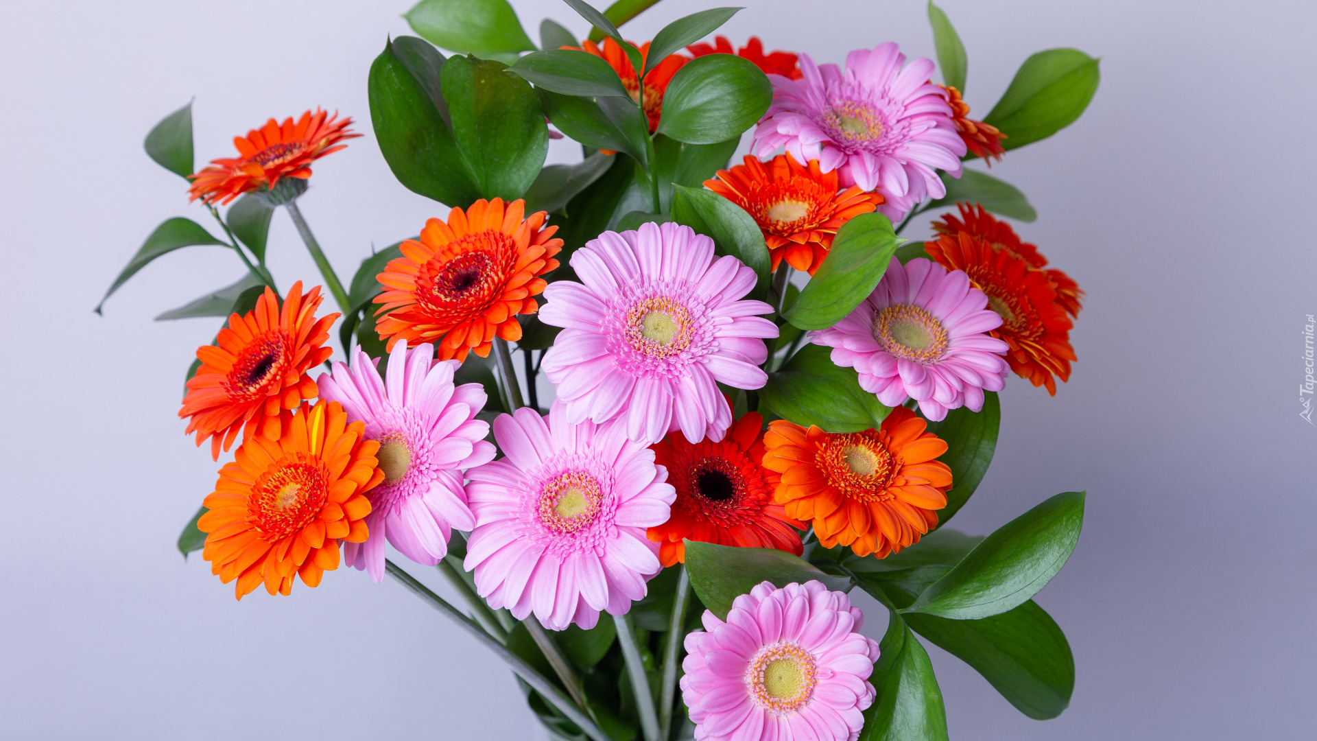 Edytor tapety: Różowe i pomarańczowe gerbery w bukiecie