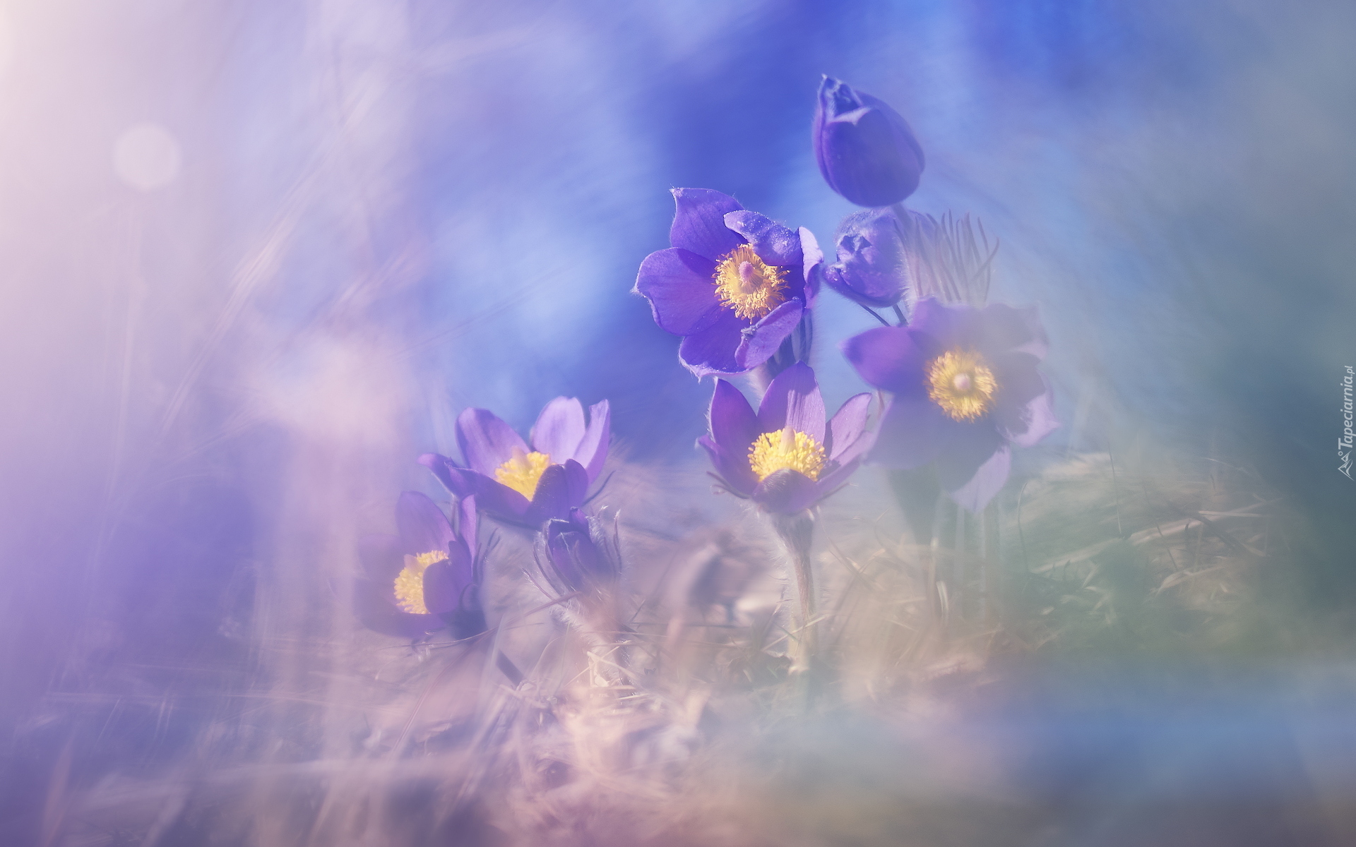 Edytor tapety: Sasanki w rozmyciu na niebieskim tle