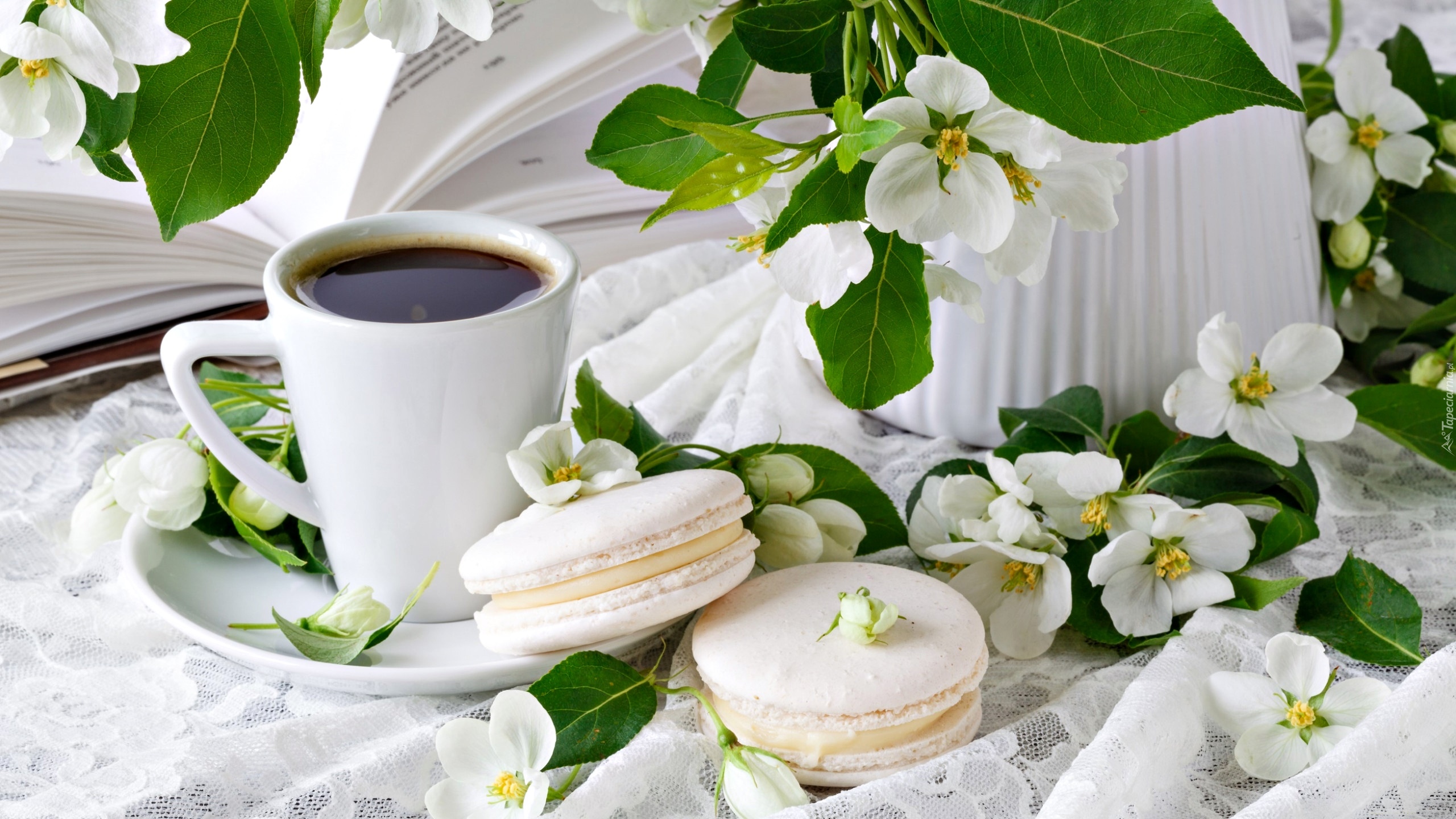 Edytor tapety: Białe kwiaty obok kubka z kawą i makaroników
