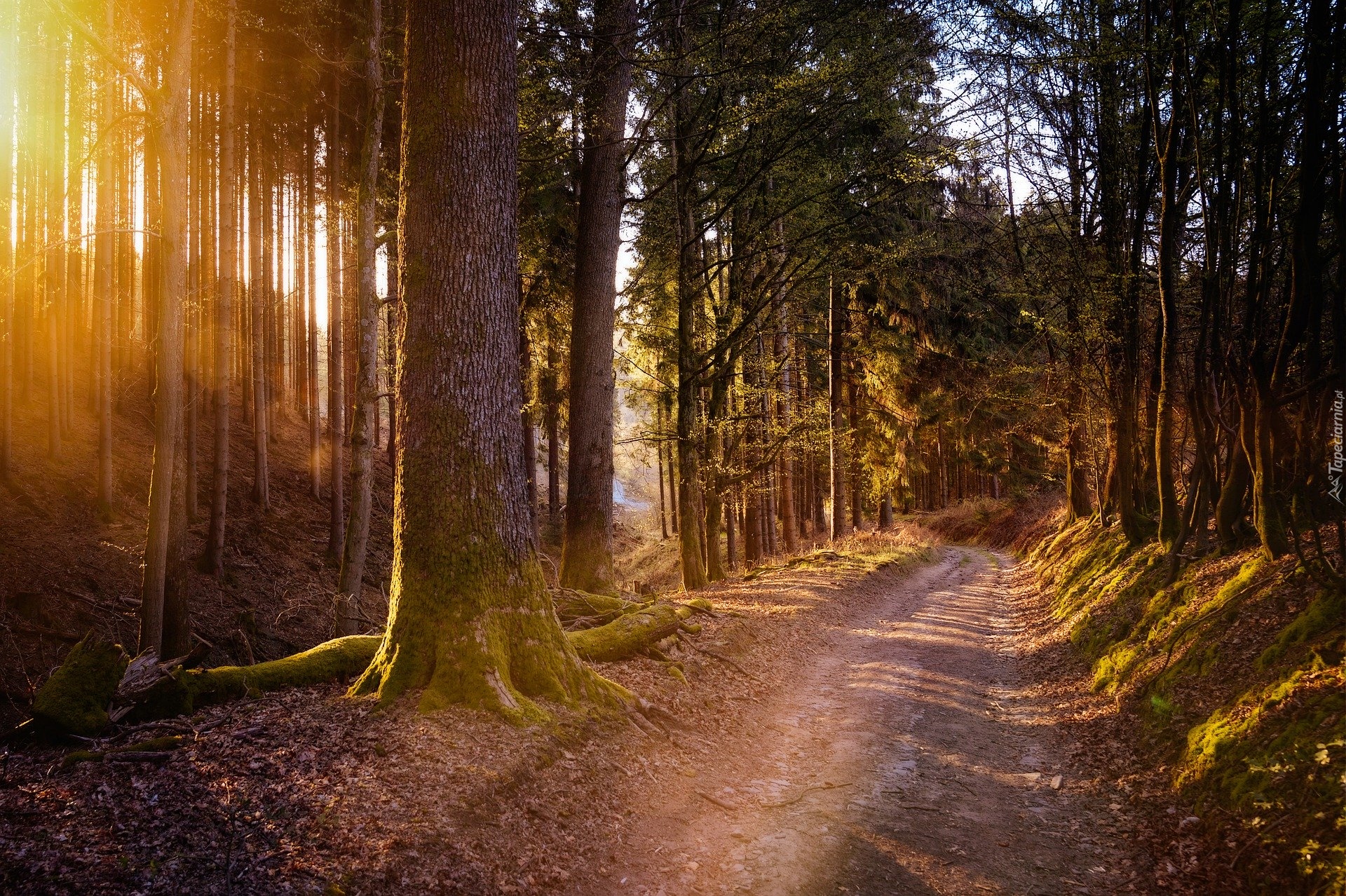 Edytor tapety: Słoneczne światło na leśnej drodze